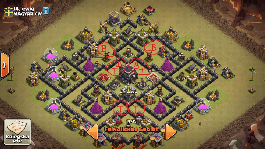 - Von 11 Uhr mit Golems und Magier rein, Bombe triggern, Queen killen