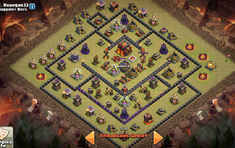 ich brauche mal wieder Eure Hilfe im CK. Ich bin Rh9 und habe einen Rh10 erwischt. ich möchte versuchen 2 Sterne zu holen und bräuchte dazu mal Eure Meinung. Meine Idee ist von oben mit Drachen oder Ballons zu kommen und die 2 oberen LA's mit Lavahunden abzulenken. Ein paar Lakaien wollte ich auch noch mitnehemn. Infernos(LV3) stehen auf Multi und die 2 oberen Bögen auf Boden. In der Clanburg ist vermutlich ein Lavahund und Ballon. Was meint ihr, funktioniert das und was ist besser Ballon oder Drachen. Nebenbei gefragt, gehen die Ballons auch direkt auf das Rh oder nur auf Deff? Vielleicht gibt es ja auch andere Ideen. Danke