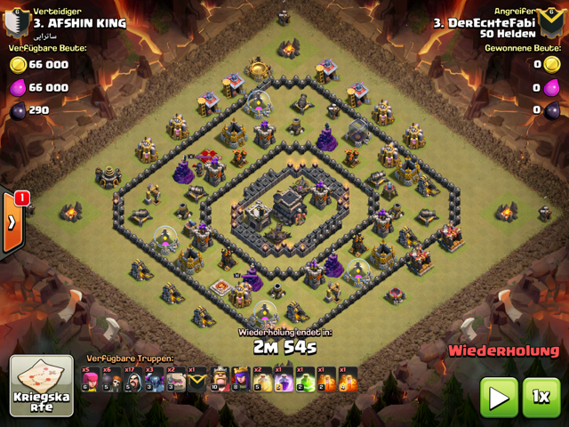 Unser Gegner hat im ck vier mal eine sehr ähnliche Base dabei. Wir haben Probleme damit mehr als einen Stern zu holen, da die Truppen außen rum rennen und den Sprungzauber in die Mitte ignorieren.
