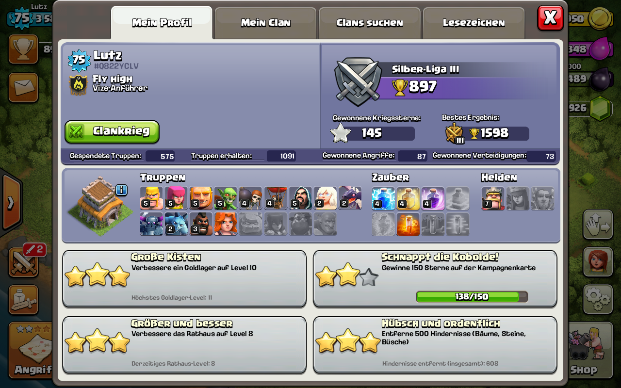 8 Walküren, 8 Schweinereiter, 8 Ballons, 4 Mauerbrecher und 10 Magier, 1 Riesen, 3 Bogenschützen - in der Clanburg lvl 7 Riesen 4-5x