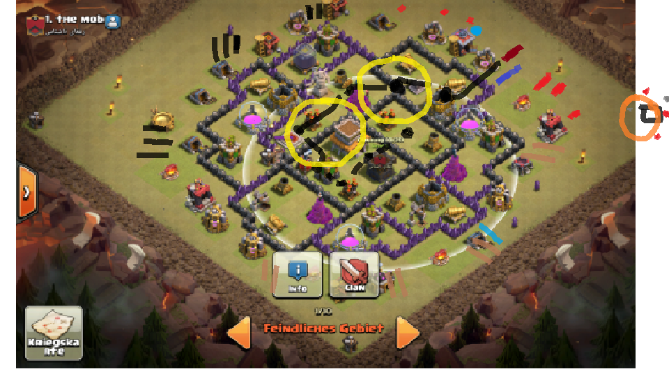 Die Schwarze Linie soll den Optimalen Weg deiner Walküren anzeigen.Leider besitzt du noch keinen Erdbebenzauber, Golem oder jene erforderliche max Einheit deines Rathauses die man für eine 3* Taktik gebrauchen könnte (Golem,Schweinereiter,Ballons,Walks) und es deswegen auch etwas schwerer sein kann.