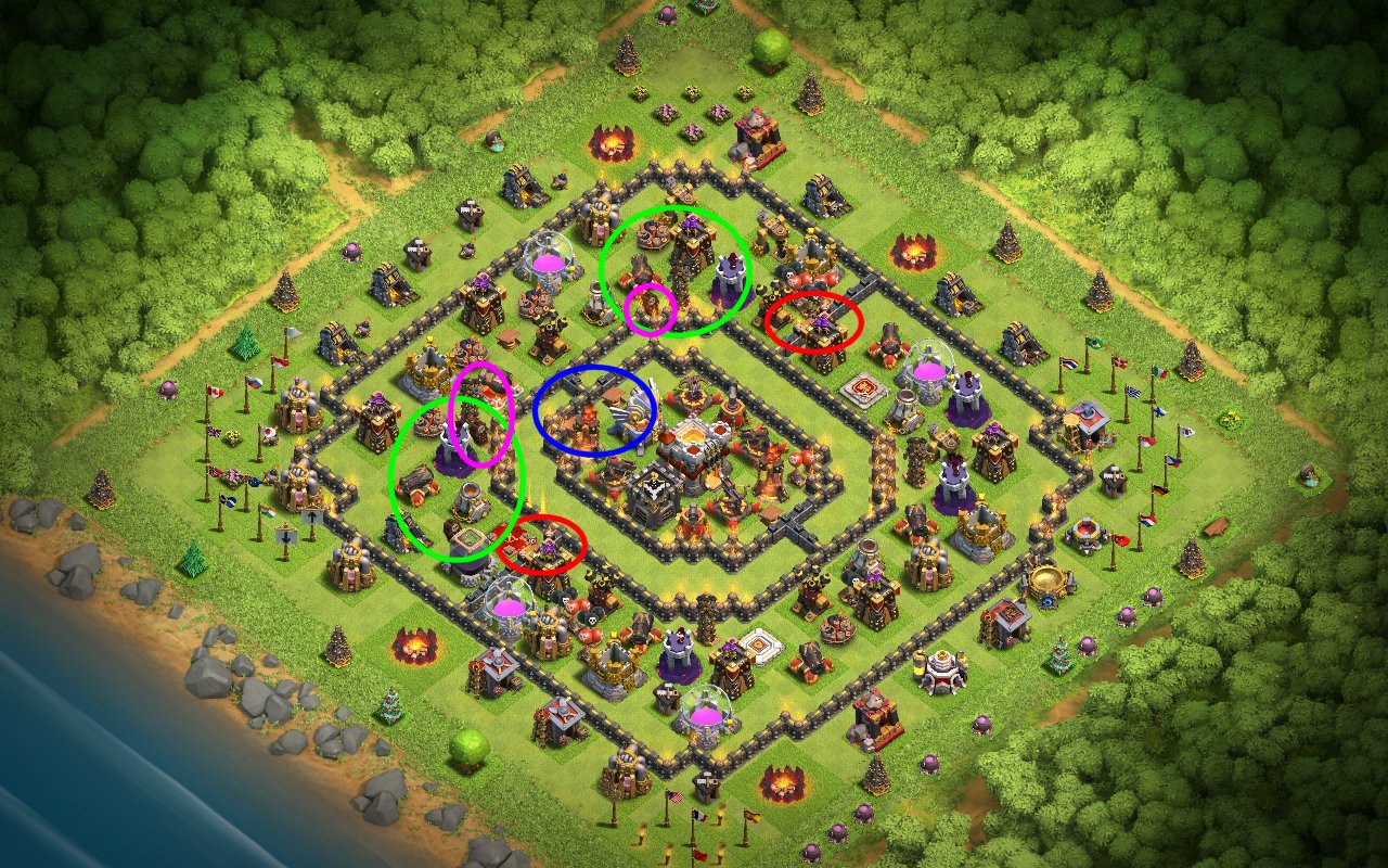 rosa Kreise: Valkies werden von Bodentruppen angelockt, auch von den Skelettfallen! Deshalb sollen die Skelette die Valkies vom Kern ablenken. Skelettfallen im Kern sind tödlich! Auch die 4 Teslas habe ich aus diesem Grund in die 4 Ecken verteilt. Wenn die Queen meint dass der Funnel für die Valkies steht dann kommen die Teslas raus und locken sie zur Seite.