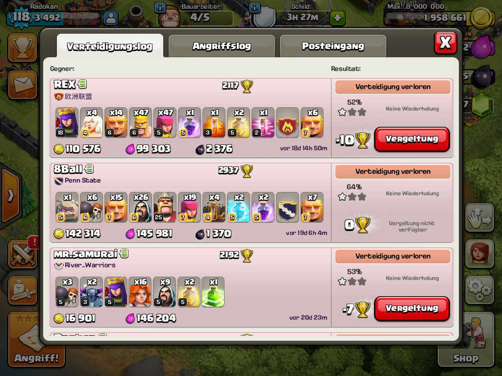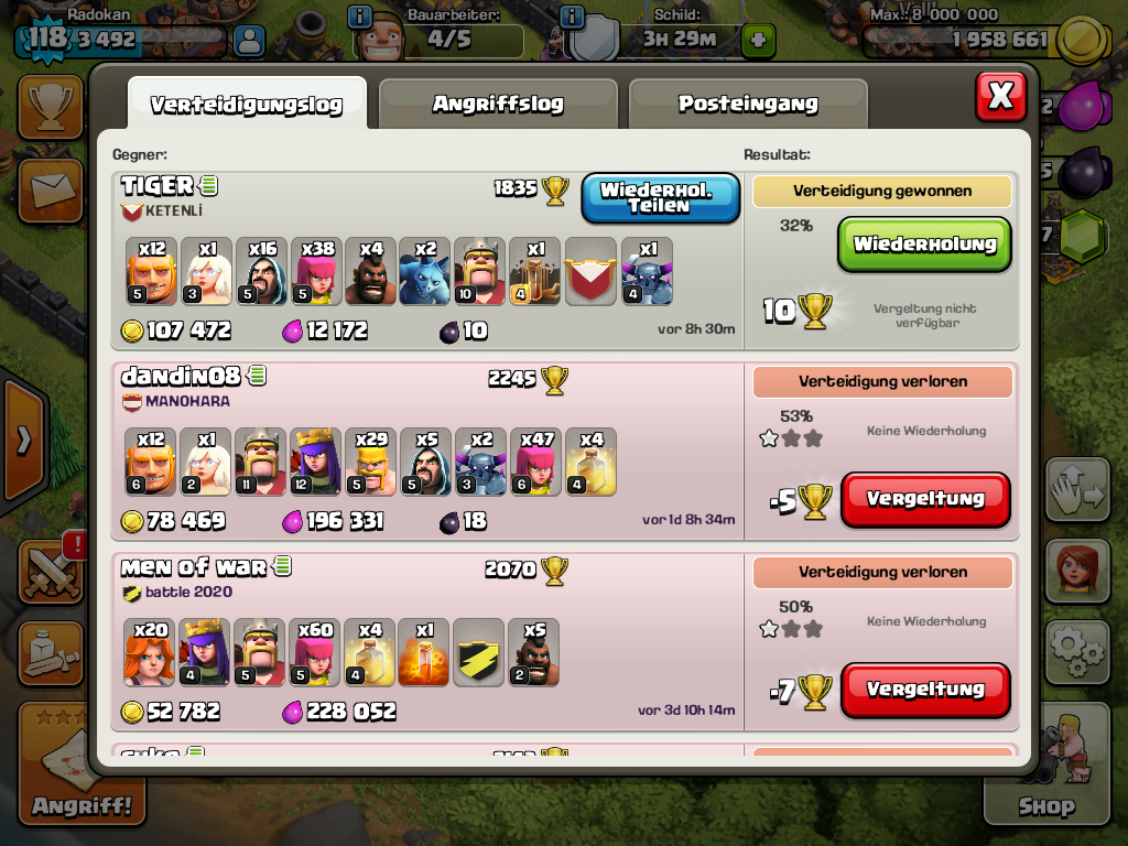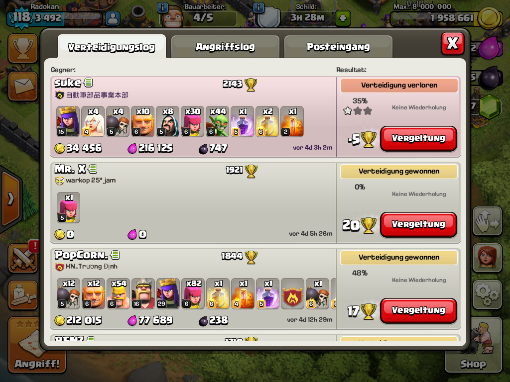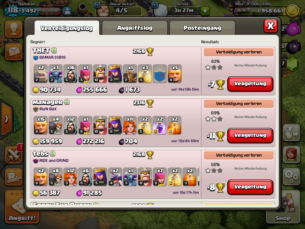 Meistens haben die angreifer auch nur noch 3 valks und ein paar 2 mags am ende uebrig... manchmal rennt die zeit weg. Aber grade im letzten krieg haette ich das tablett an die wand schmeißen koennen. 2 fails auf mich mit govaho und dann kommt der 9.5er mit seinen 30iger helden und 5er valks, ohne planung einfach mal 18 uebers dorf gejagd.... die hälfte renn ums dorf... alles stirbt außer einem minigolem und seiner 30iger queen die auf 50% hp ist... und das reicht dann noch fuer die letzten 3 pointdeffs, 3 sterne auf die letzte sekunde ![]()