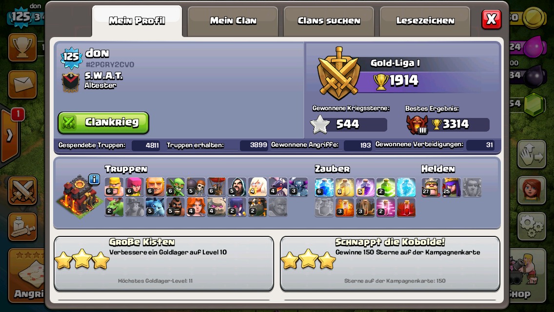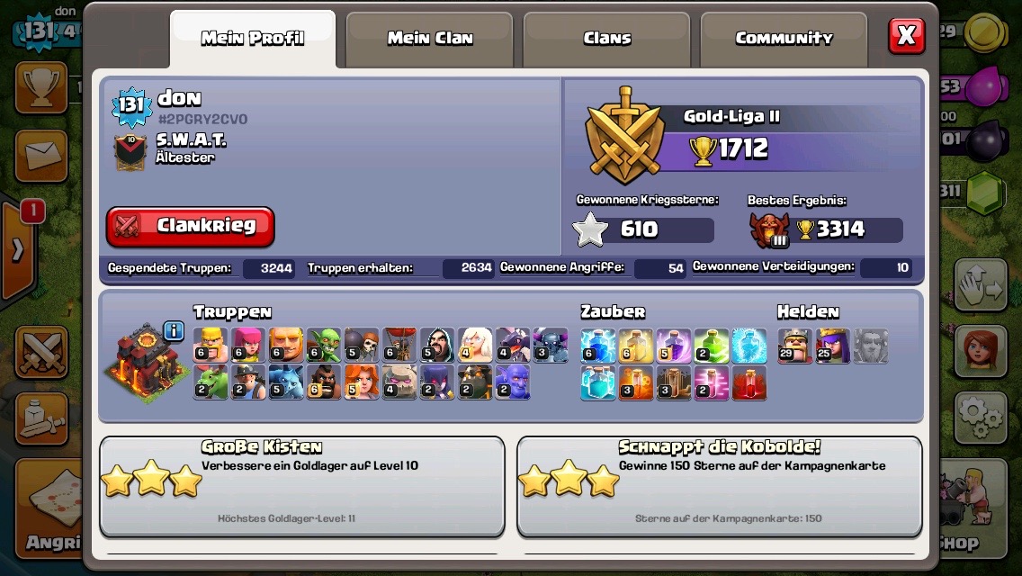 Wie zu sehen ist, bin ich nicht mit max Helden hoch. Die Mauern waren einfach ein Stück weit eher fertig und ich wollte die 5 Wochen nicht als Premiumfarm dienen.