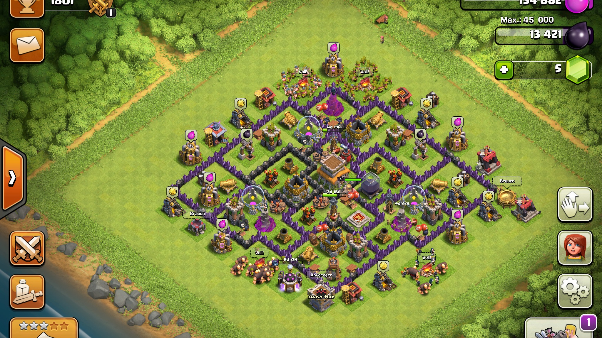 Du hast 8 äußere Abteile und 7 Verteidigungen mit Flächenschaden (Mörser, Magierturm). Verteil sie auf je ein Abteil um gegen die einfachsten Barch-Angriffe geschützt zu sein.
