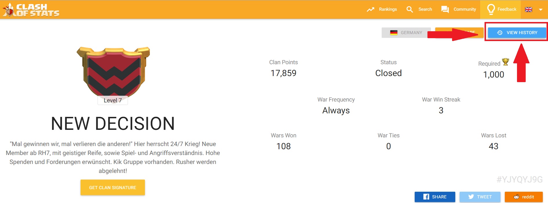 Als Beispiel mal euer Clan "New decision" #YJYQYJ9G