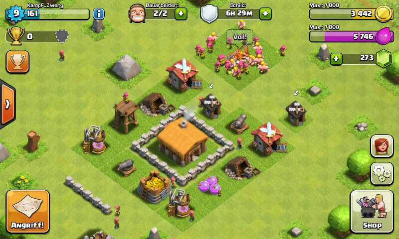 wollte euch mal zeigen wie niedlich so ein level 2 dorf ist (level 1 ging nicht, da man noch im Tutorial ohne ausgelevelt zu haben direkt auf rh 2 geleitet wird).