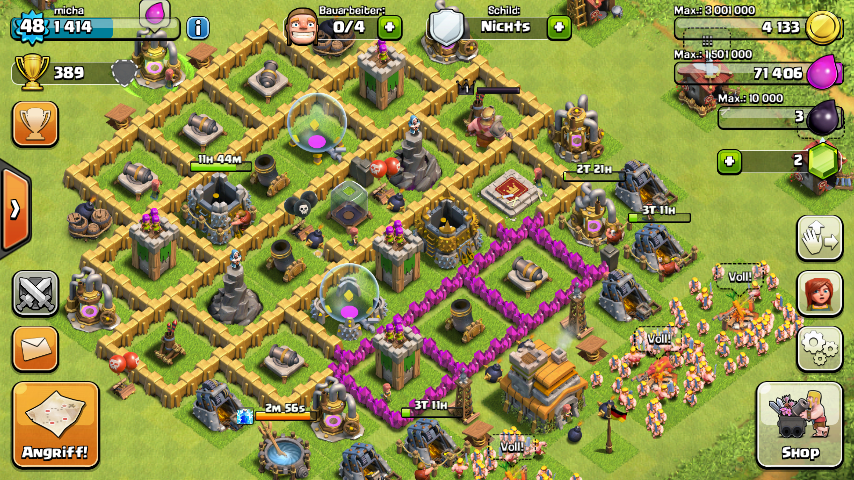 Von der Struktur ist deine Base okay. Wie du selbst sagst, musst du dringend die Mauern upgraden. Zudem hast du in den Verteidigungseinheiten viele Defizite. Deine Magiertürme sind, wenn ich es richtig sehe, auf Level 1, maximal auf Level 2. Als erstes würde ich dir empfehlen, Luftabwehr und Flächenschaden (Magiertürme / Minenwerfer) upzugraden, dannach die Mauern, anschließend Bogenschützentürme und Kanonen. Nebenbei solltest du auch die Mauern mindestens auf Level 6 bringen. Auch deine Elixiersammler 7 Goldminen sollten nebenbei gemacht werden, da sie auf Level 11 schön viel produzieren. Deine Zauberspruchfabrik solltest du auch dringend weiterupgraden, sie nützt viel.