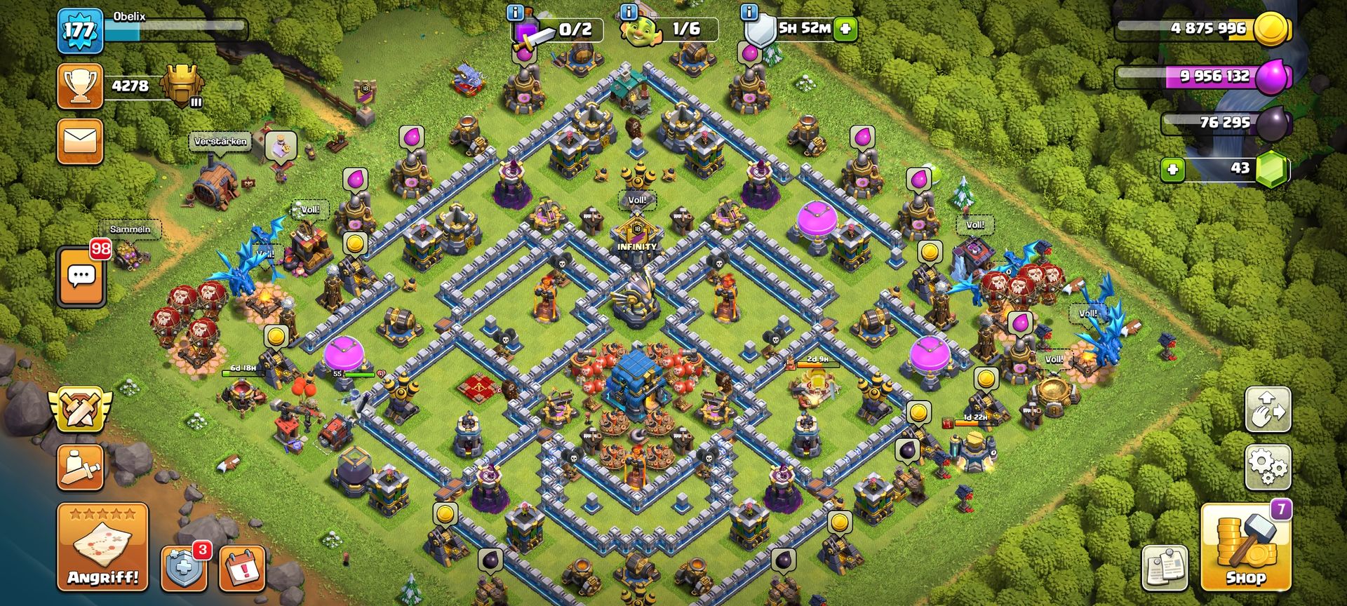 Jedoch gibt's ein Angriff der eigentlich nicht möglich ist: ein rh8 Dorf hat mich mit LV 1!!!! Drachen angegriffen, ohne Held und ohne Zauber!!!! Und er hat innerhalb von 58 sek. Drei Sterne geholt!!! Ich habe 59 Pokale verloren und als ich schaute in welcher Pokalregion er kam traf mich der Schlag: er hatte NULL!!!! Pokale und es war kein Racheangriff denn die Vergeltung war verfügbar bei mir???