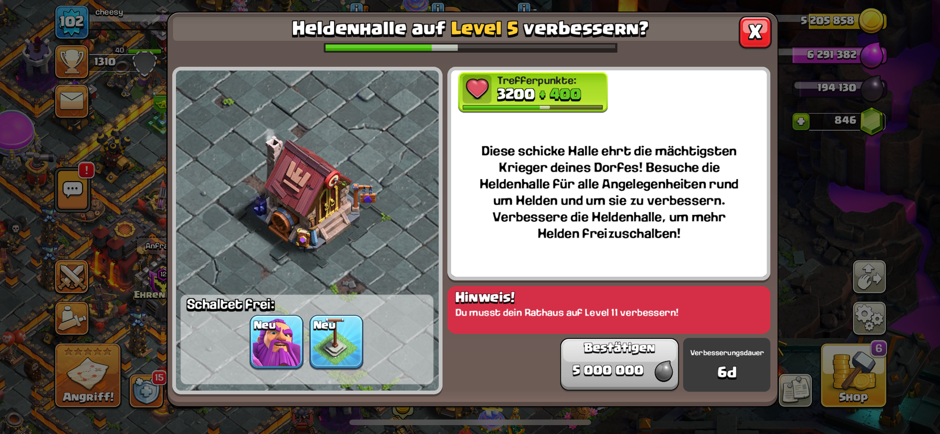 Dabei ist mir aufgefallen, dass der eine eine heldenhalle auf lvl5 mit warden hat, der andere sie auf lvl 4 hat und es nicht möglich ist sie auf lvl 5 zuupgraden.