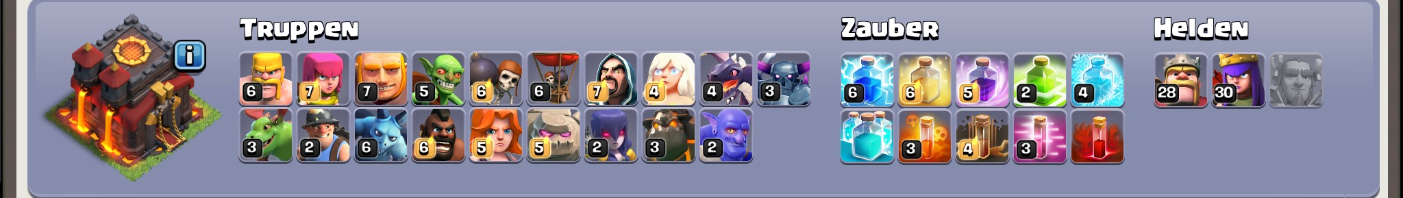 #66 Wenn du bowler nicht magst kannst du es doch auch mit golaloon versuchen. Von rechts kriegst du mit 1-2 Golems magiern und Helden locker beide las die queen und den inferno. Einen Golem beim Mörser setzen einen bei der oberen la, dahinter magier, beim bombenturm rein mit helden. Dann bleibt nur noch ein normaler laloon von links. Am besten aber vorher oben nen paar loons mit nem eil setzen, die Fliegen dann runter Richtung la und dann von ganz links mit lavahund loons. Wo in etwa würde ich es machen