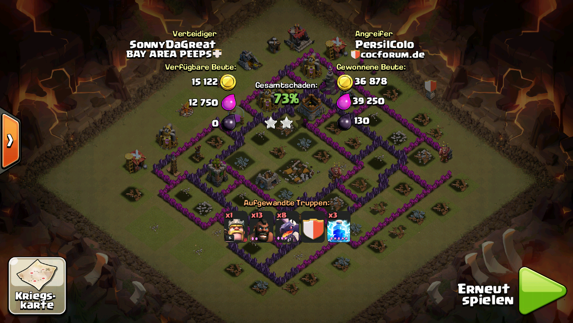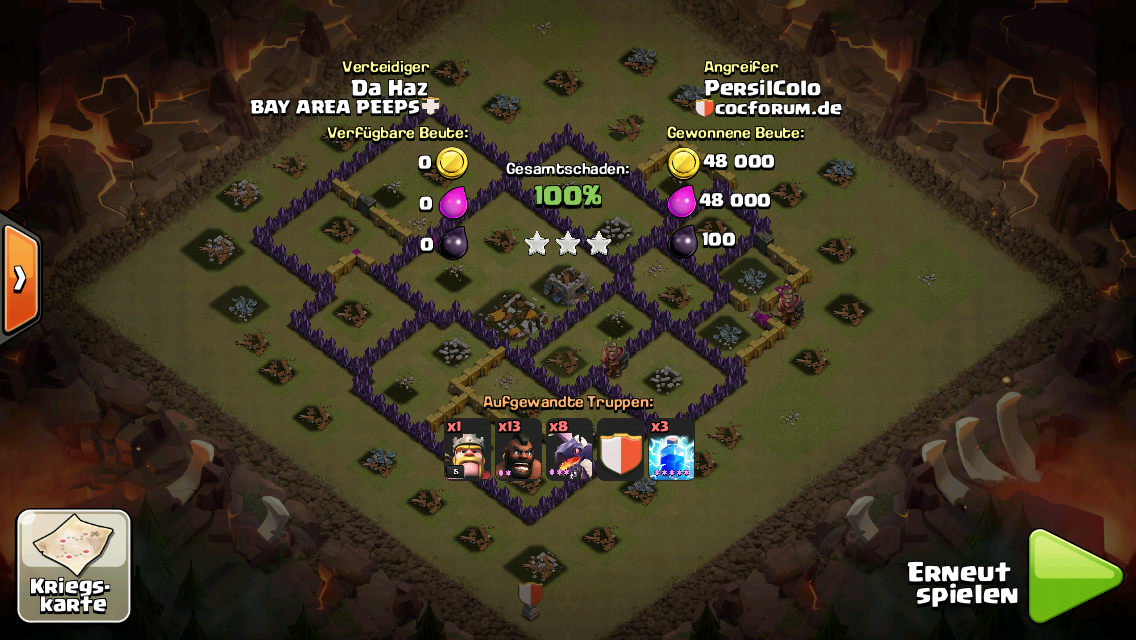 Hätte ich die Schweine etwas weiter unten gedroppt, hätten sie wahrscheinlich erst die LA zerstört (so sind sie erst zum Bogiturm gelaufen), dann wären es eventuell 3 Sterne geworden