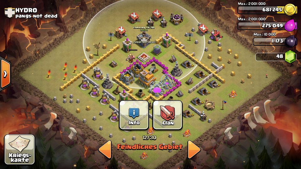 - Setze dann deine restlichen Riesen nord-westlich (dort wo ein Minenwerfer und ein Magierturm nebeneinander stehen), sprenge die Mauer auf und lass die Riesen ein bisschen das Dorf aufräumen. Mit Heilzaubern kannst du sie unterstützen.