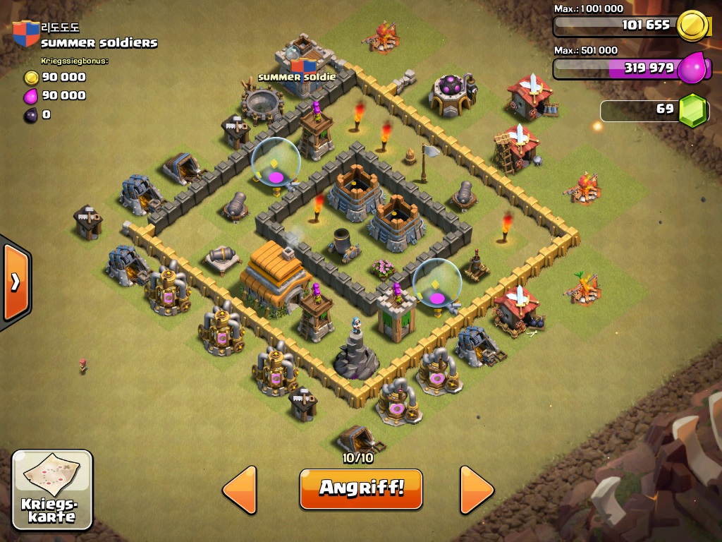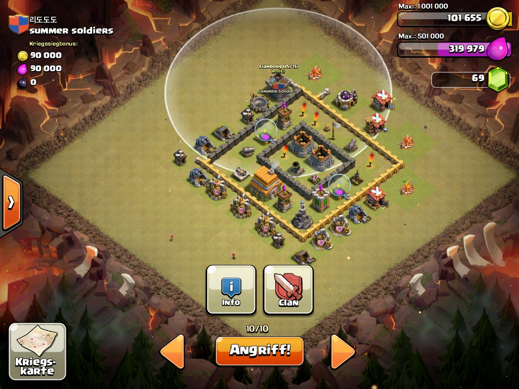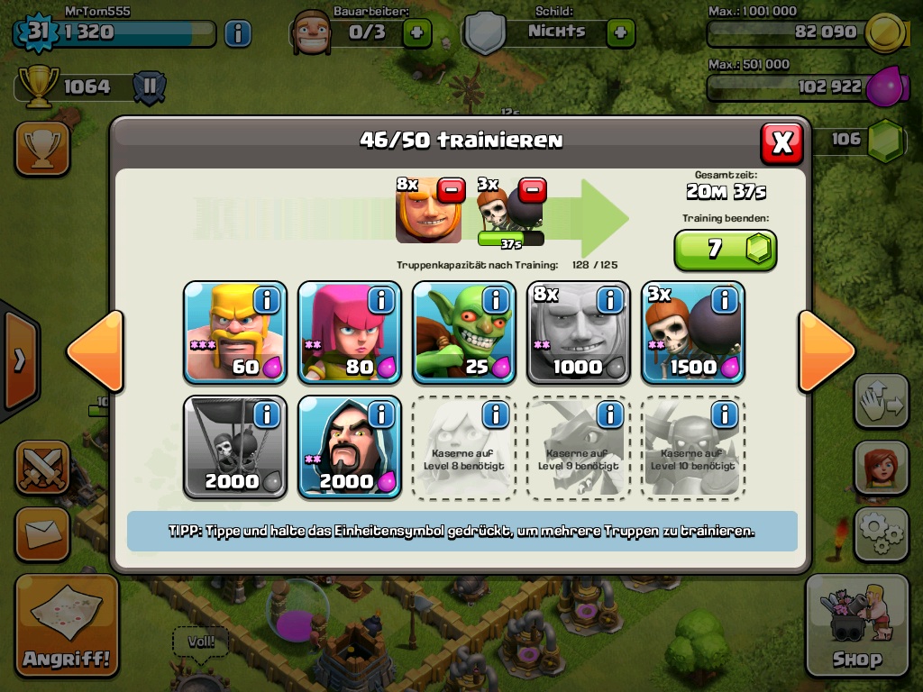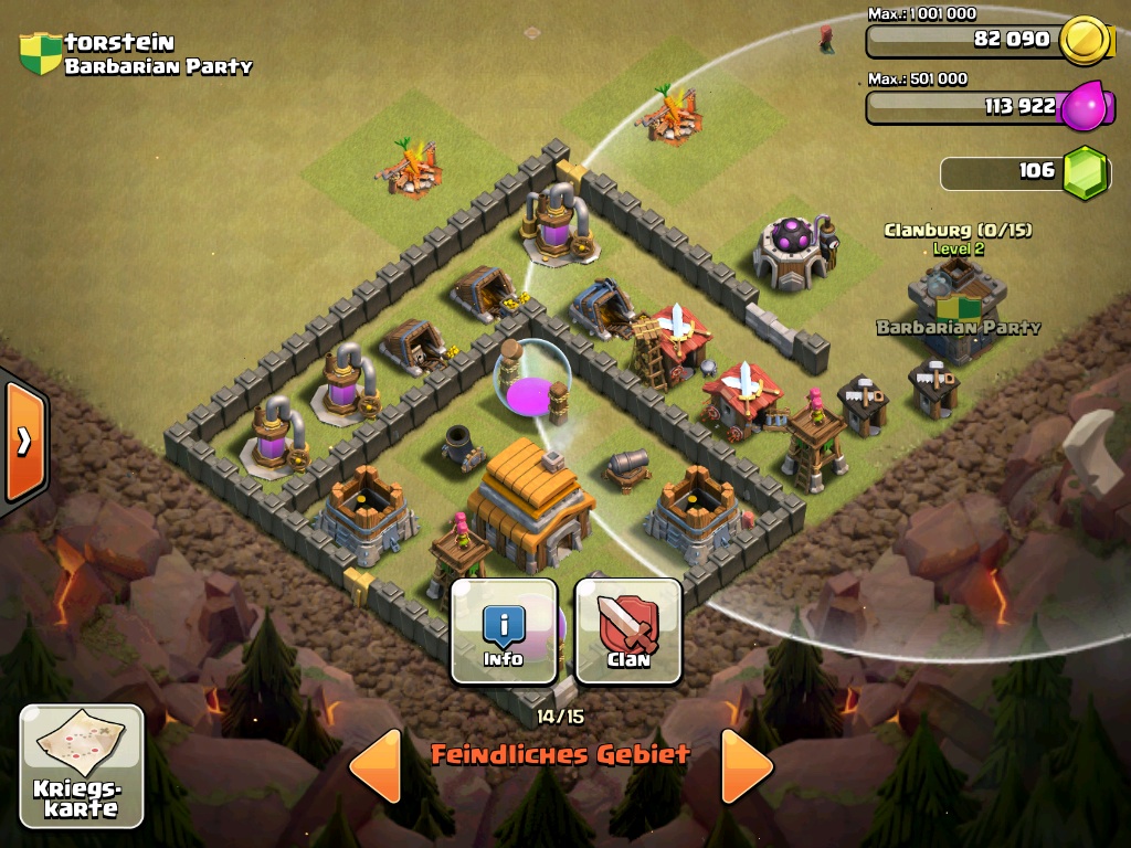 Tränke hab ich bisher nur den Blitz auf lvl 1 und in der Clanburg haben 15 Truppen platz.