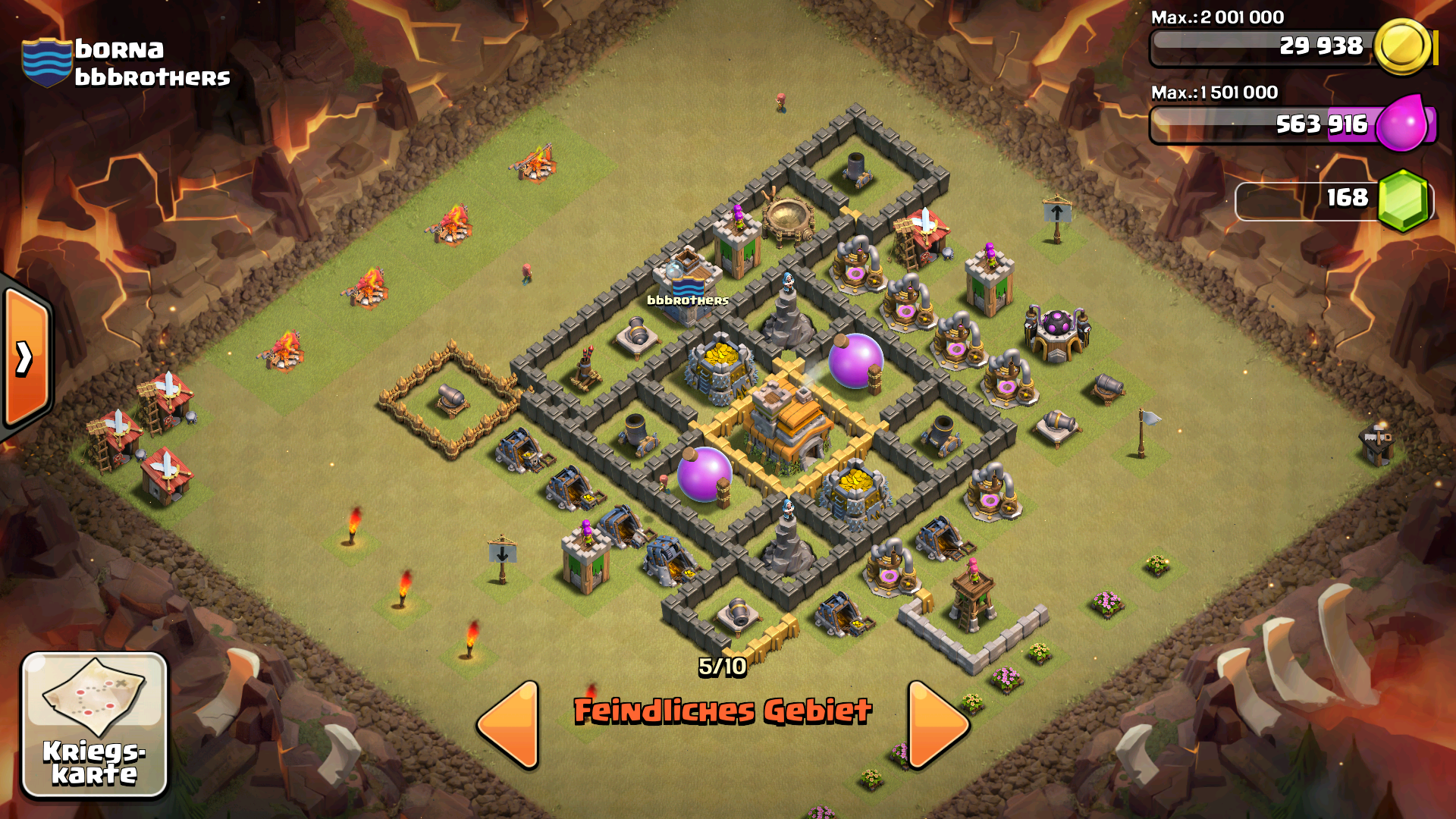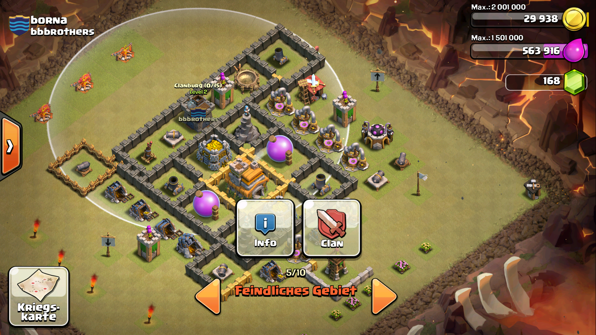 In etwa zwischen die Luftverteidigung und die Kanone dort setzt du die Riesen und zwei, drei Mauerbrecher hinterher. Sobald die Riesen die Luftverteidigung ausgeschaltet haben, setzt du hinterher den Heiler. Dann einfach mit Mauerbrechern unterstützen, bis sie dir ausgehen und die Magier als Aufräumtruppen hinterher, sobald die Riesen eine gute Menge Verteidigungen ausgeknipst haben. Um den Minenwerfer oben, die Minikanone links und die beiden außenstehenden Türme können sich jeweils ein Riese + ein Magier kümmern, dann sparst du da Zeit. Ebenso sparst du Zeit, wenn du schonmal relativ früh mit einem oder zwei Magiern die Armeelager und Bauhütten beseitigst.