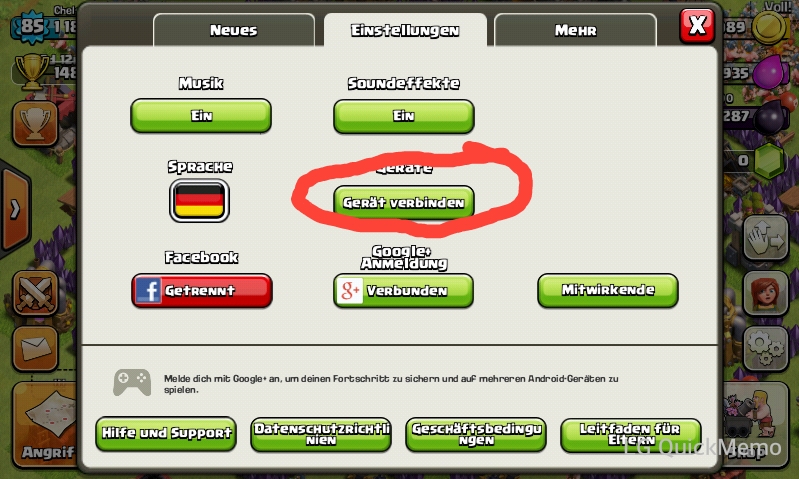Vergiss nicht, dein Dorf über die Google+ Anmeldeschaltfläche mit Google+ zu verbinden. Wenn du dies nicht tust, kannst du dein Dorf nach der Wiederherstellung der Werkseinstellungen des Geräts oder nach einem Gerätewechsel nicht wiederherstellen.