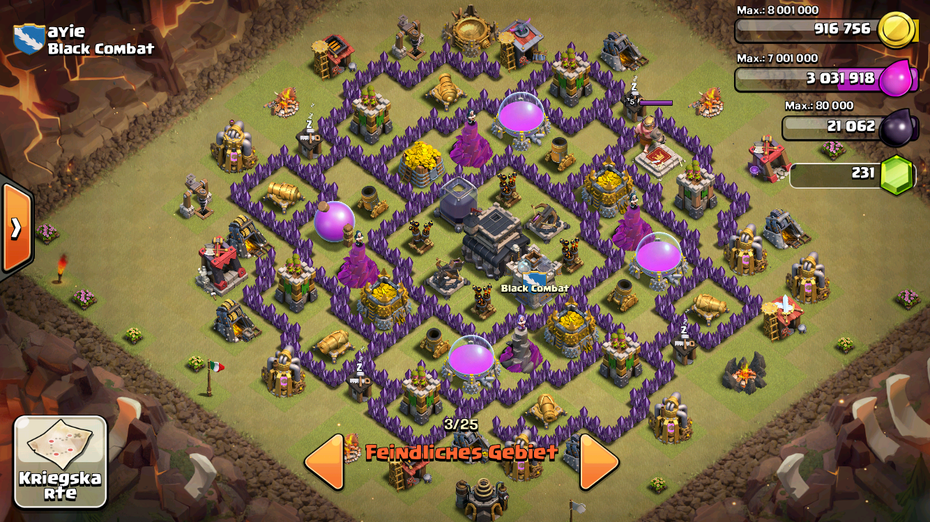 Mein Lager hat eine Kapazität von 220, der König ist auf 10 die Queen auf 5. Heilzauber auf 6 und Wutzauber und Blitz auf 5, Loons auf 3. Meistens habe ich mit Hogs oder mit Riesen level 6 angegriffen. ...Für alle Clans die einen guten Gegner suchen wären hier genau richtig :)