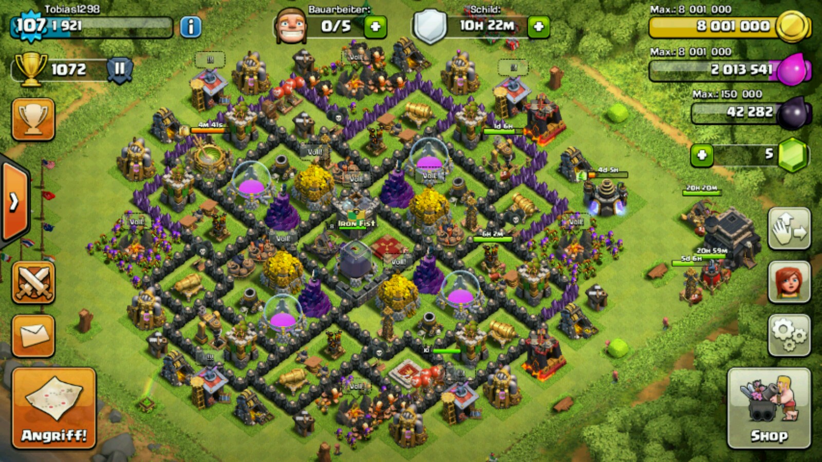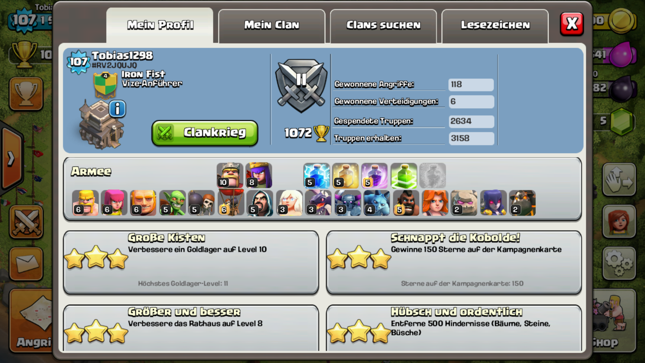 Lavahund, Bogis und Barbaren sind mittlerweile auf Rathaus 9 Niveau. Zurzeit wird der Sprungzauber verbessert. Als nächstes werd ich dann wohl den Heilzauber machen, oder schon Richtung dunkle Truppen gehen (Golem, Hexe)Verteidigung: