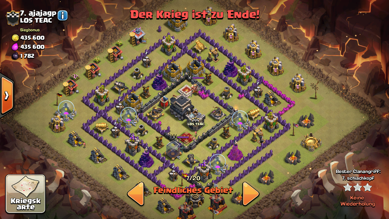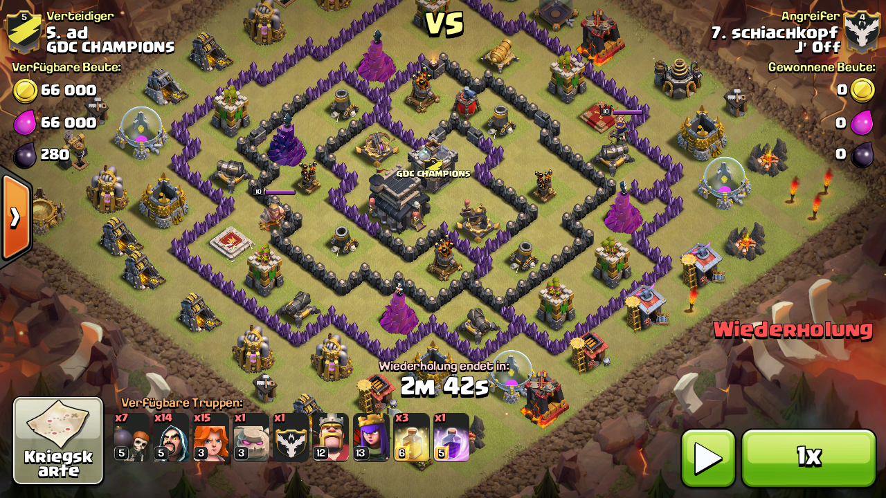 Ich habe leider keine Konstellation von einem 3 Sterne Angriff parat da die Replays wegen dem Ende des Hog events weg sind. Im Bild 1 waren es am Ende 89% und 1 Stern da der cut misslungen ist und auf Bild 2 eben 3 Sterne, nur leider ohne Replay. Mit lvl3 valks ist also schon einiges möglich und 3 Sterne sind durchaus drin, aber wir haben auch keinen im Clan der so oft auf 99% gekommen ist