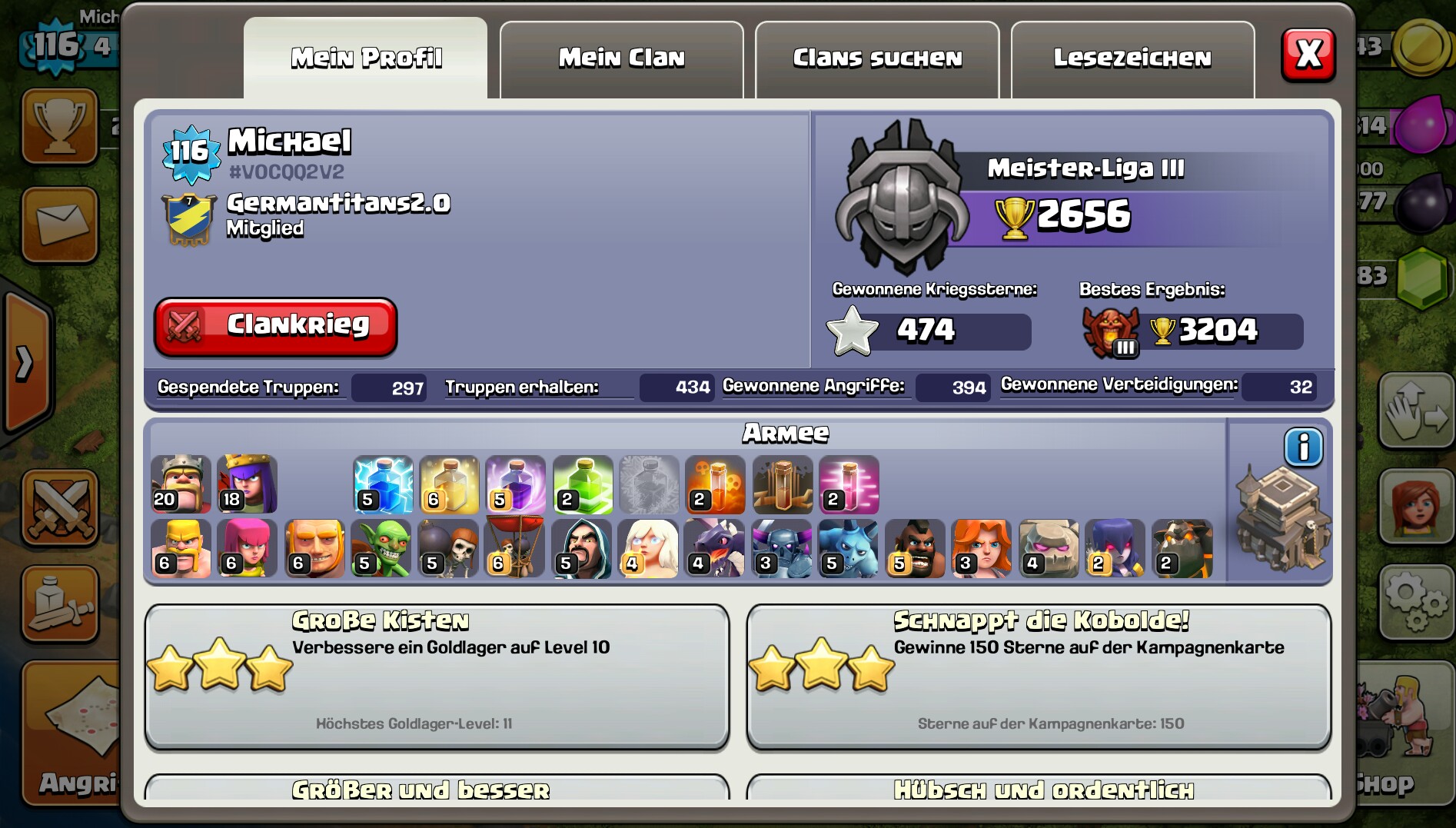 #6 So nach längerer Zeit wieder ein kleines Update von meinem Dorf. Es ist soweit alles max bis auf Mauern, Helden und ein paar Laborverbesserungen. Ich will meine Helden bis mindestens 25 uppen, bis ich auf Rathaus 10 gehe. Ich denke das ich mit den Mauern schneller fertig sein werde, als mit dem Helden. Darum bin ich geradeauch in M3 um bisschen Delex zu farmen. Über Kritik und Verbesserungen würde ich mich sehr freuen.