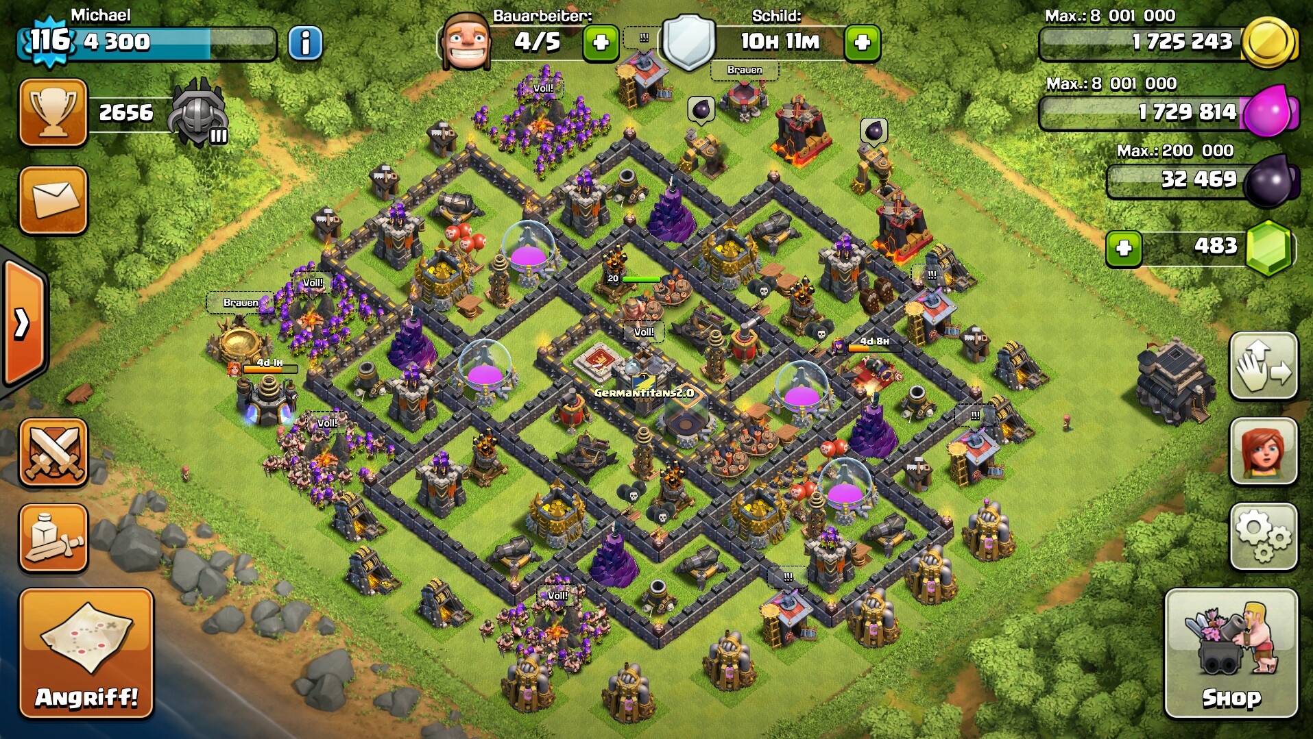Ich habe vor alle Mauern auf 10 und meine Helden bis mindestens 25 zu uppen. Truppen sind soweit max bis auf den heiler, die lakis und natürlich die walks. Die dunklen Zauber werden dann während ich mauern und helden mache hochgezogen.