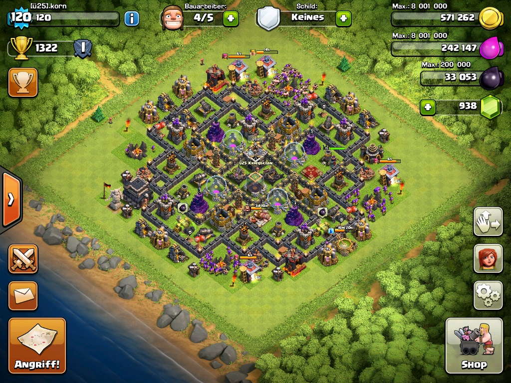 Meine Gebäude sind alle auf maximum, meine Mauern sind zu 1/3 fertig, leider sind meine Helden noch sehr low, 30er Combo. Den Luftfeger habe ich noch gar nicht gebaut und habe es auch nicht vor.