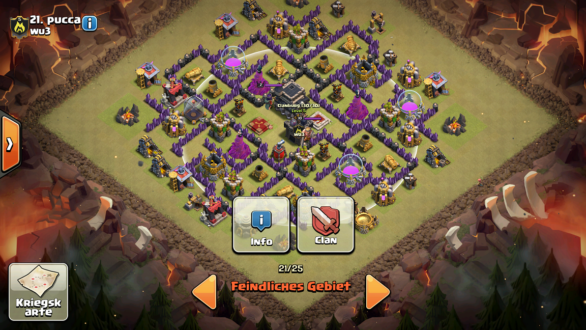 Meinen zweiten Angriff habe ich auch gegen einen Rh9er benutzt mit nur Hogs. Dabei ging die Clanburg mit King lvl 8 auf die Level 10 Königin. Gleichzeitig marschierten alle Hogs los.