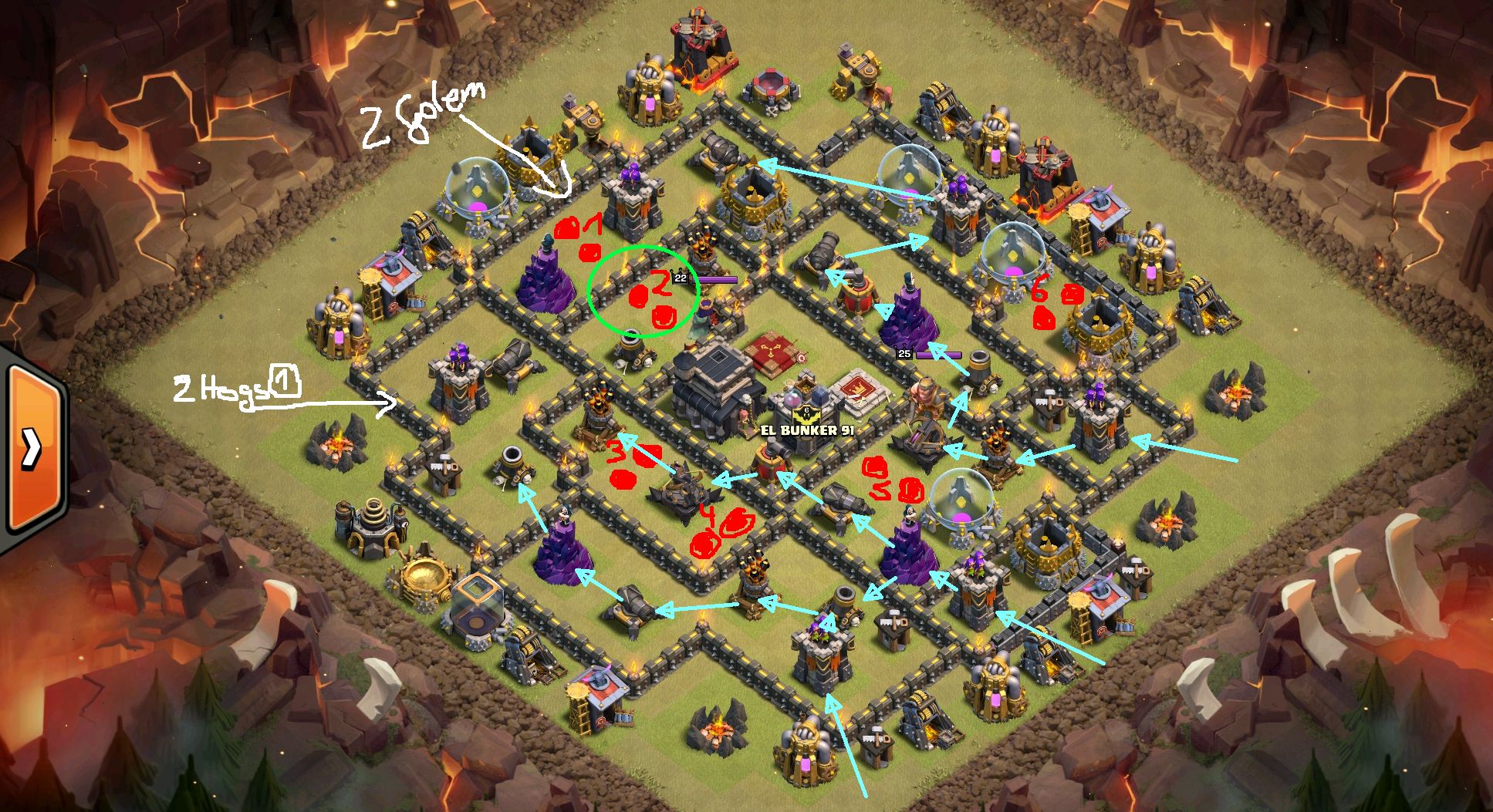 #4 Ich würde das Dorf mit Hogs angreifen, vorher mit einer kleinen Killsquad (Golem, Helden, ein paar Magier) die gegnerische Queen und die Clanburg ausschalten. Bei der Gelegenheit kannst du auch gleich eine Handvoll Hogs mit reinschicken, welche die Verteidigung im Südbereich dezimieren (und dabei den Golem etwas schonen). Wenn doppelte Riesenbomben vorhanden sind, dann beim Rathaus, halte ich aber für unwahrscheinlich, eher werden dort die Teslas stehen. Ein oder zwei Riesenbomben löst du vielleicht schon aus, bevor der eigentliche Hogangriff erfolgt.