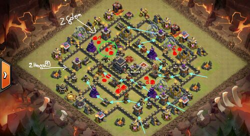 #4 Ich würde das Dorf mit Hogs angreifen, vorher mit einer kleinen Killsquad (Golem, Helden, ein paar Magier) die gegnerische Queen und die Clanburg ausschalten. Bei der Gelegenheit kannst du auch gleich eine Handvoll Hogs mit reinschicken, welche die Verteidigung im Südbereich dezimieren (und dabei den Golem etwas schonen). Wenn doppelte Riesenbomben vorhanden sind, dann beim Rathaus, halte ich aber für unwahrscheinlich, eher werden dort die Teslas stehen. Ein oder zwei Riesenbomben löst du vielleicht schon aus, bevor der eigentliche Hogangriff erfolgt.