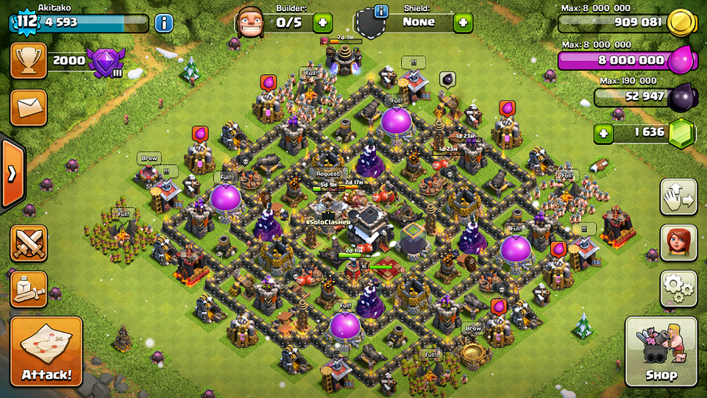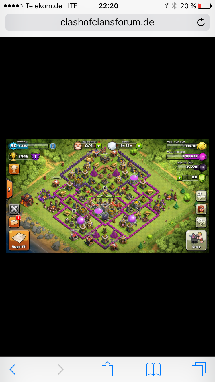 Meine Base ist komplett Maxed Out was Defense und Gebäude angeht. Die letzten 2 Bomben gehen gerade hoch und auch die Clanburg (endlich mal :D)
