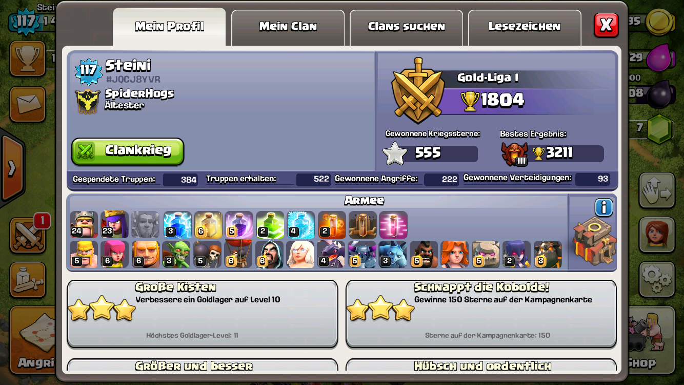 unglaubliche 154 Kriegssterne. RTH9. Goldjagd 174 Millionen / Elexierjagd 210 Millionen. King LV11 - Queen LV7. Kobold und Barsch Spezialist. Easy Germany Führungsmitglied. Noch Fragen?!? :)))
