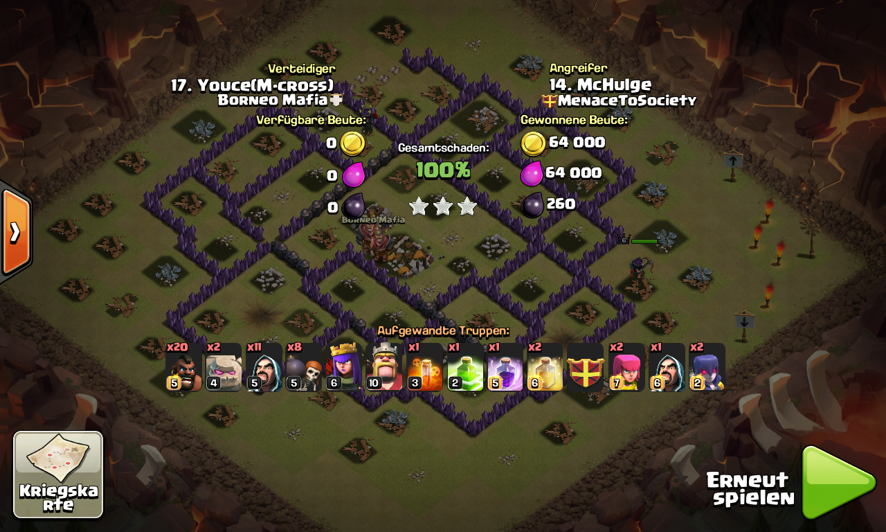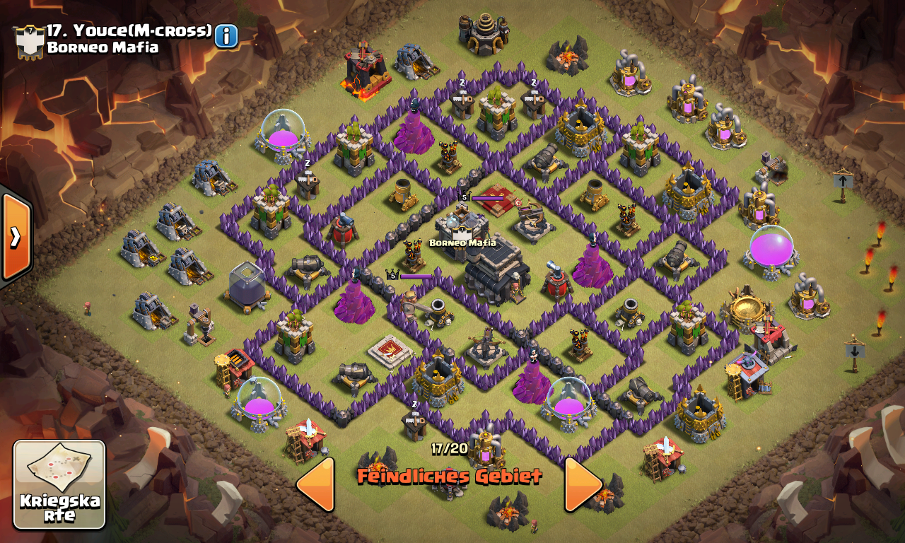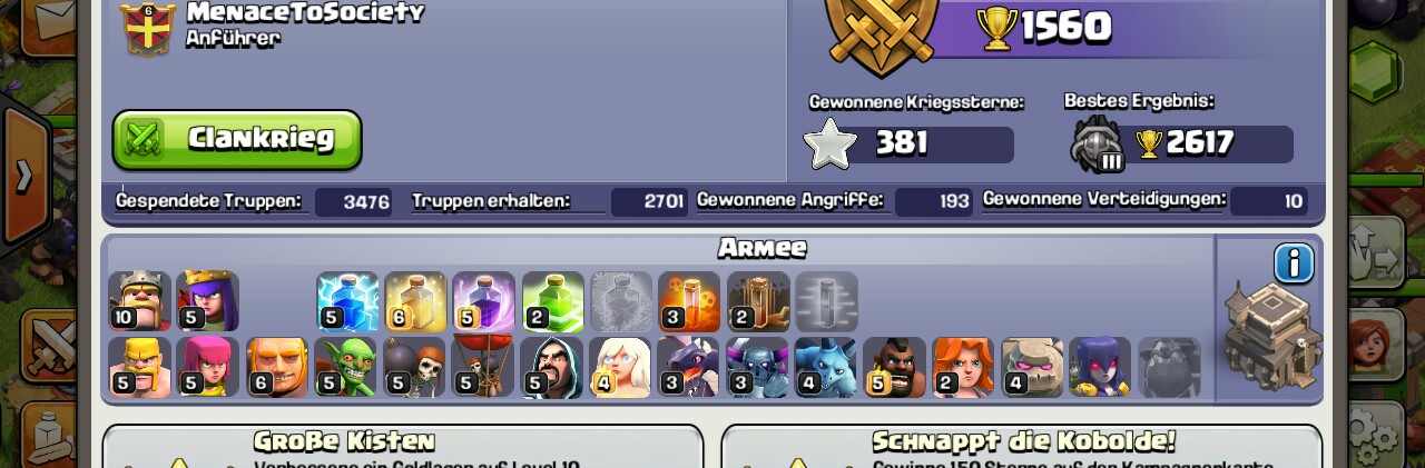 Hallo clasher, im nächsten CK habe ich folgenden Gegner zugeteilt bekommen. Habt ihr eine Idee für einen 3* ?? Ich dachte an einen gohog angriff. Wollte von der oberen Ecke mit 2 golem ( einen 4er, einen 5er aus CB) und ein paar Magier und Helden mittels jump zum Kern vordringen. Dann von der anderen Seite mit hogs und heal aufräumen. Der Gegner hat vermutlich einen Drachen und 2 loons in der cb (momentan 10/30 gefüllt). Die CB wollte ich vorher mittels einem hog raus locken und schon mal vergiften. Oder habt ihr andere Vorschläge??