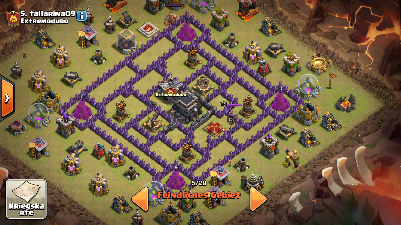 Hallo zusammen,wie würdet ihr diese Base angehen??Meine Truppen sind th 9 max,Königin auf 10,König auf 8.Ich wollte auf 10 und 11 Uhr zwei Golems setzen,gefolgt von 15 Magiern und 4 Pekkas ,die mir die Front freiräumen und den Rundlauf starten.Dann würde ich mit Erdbeben vorm DE-Lager öffnen und die Helden gefolgt von Magiern aus der Cb Richtung Rathaus schicken---bin mir aber nicht sicher--wie würdet ihr es angehen??Danke im voraus