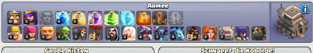 Mein Aktueller Plan würde Klassisch mit GoWipe und 2 Sterne bei diesem Gegner gehen. ( 1 Stern is schon vorhanden. ) Mit Erdbeben oben die Mauern öffnen, 3 Golems rein, mit 3 Pekka und zusätzlich einer aus Cb hinterher sowie Magiern fürs sog. funneln ? . .. So wären schonmal 2 Sterne drin. Aber der 3. Wäre cool. Daher ersuche ich euch für Konstruktive Anregungen.