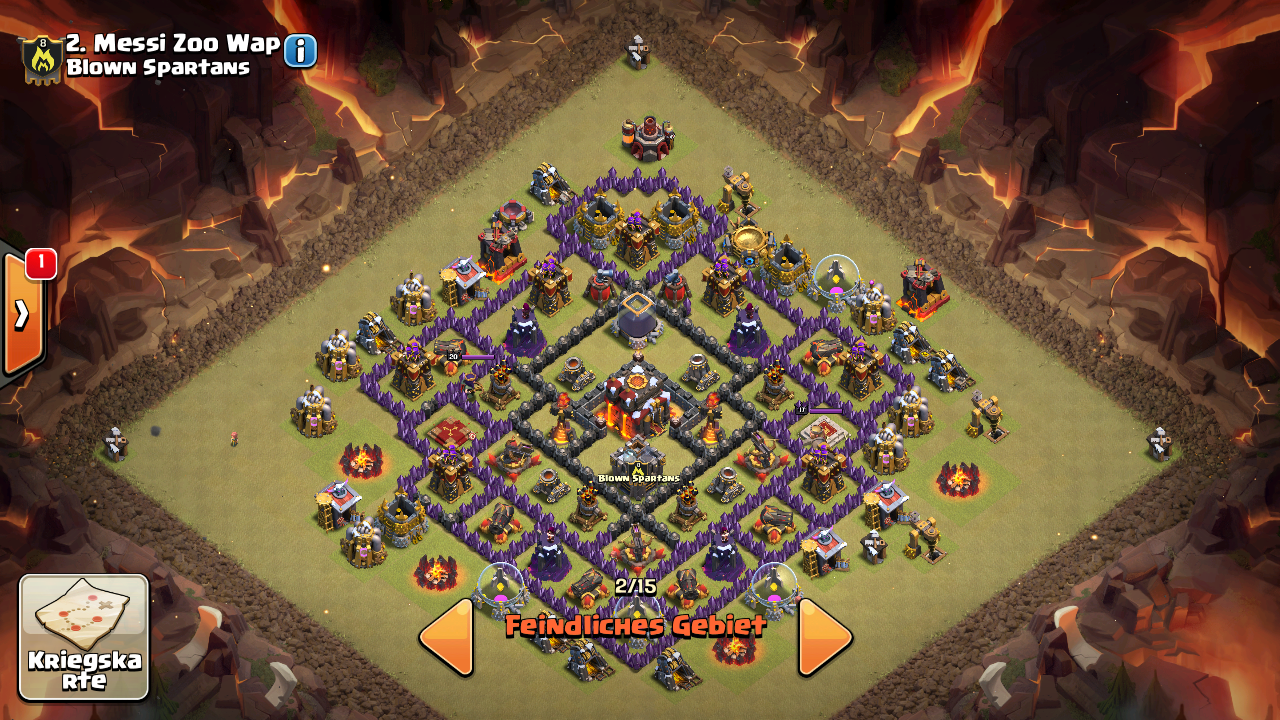 Dort würde ich die Königin mit 4 Heilern setzen, die Clanburgtruppen töten und die Königin mit ein paar Magiern und Mauerbrechern durch die Mitte lenken (Damit solltest du bis ans Rathaus kommen und dieses zerstören können).