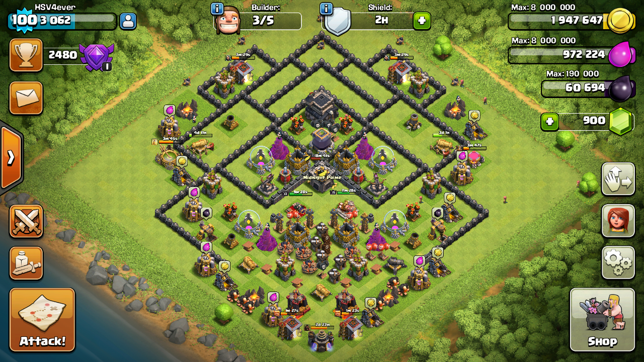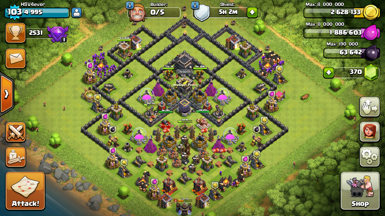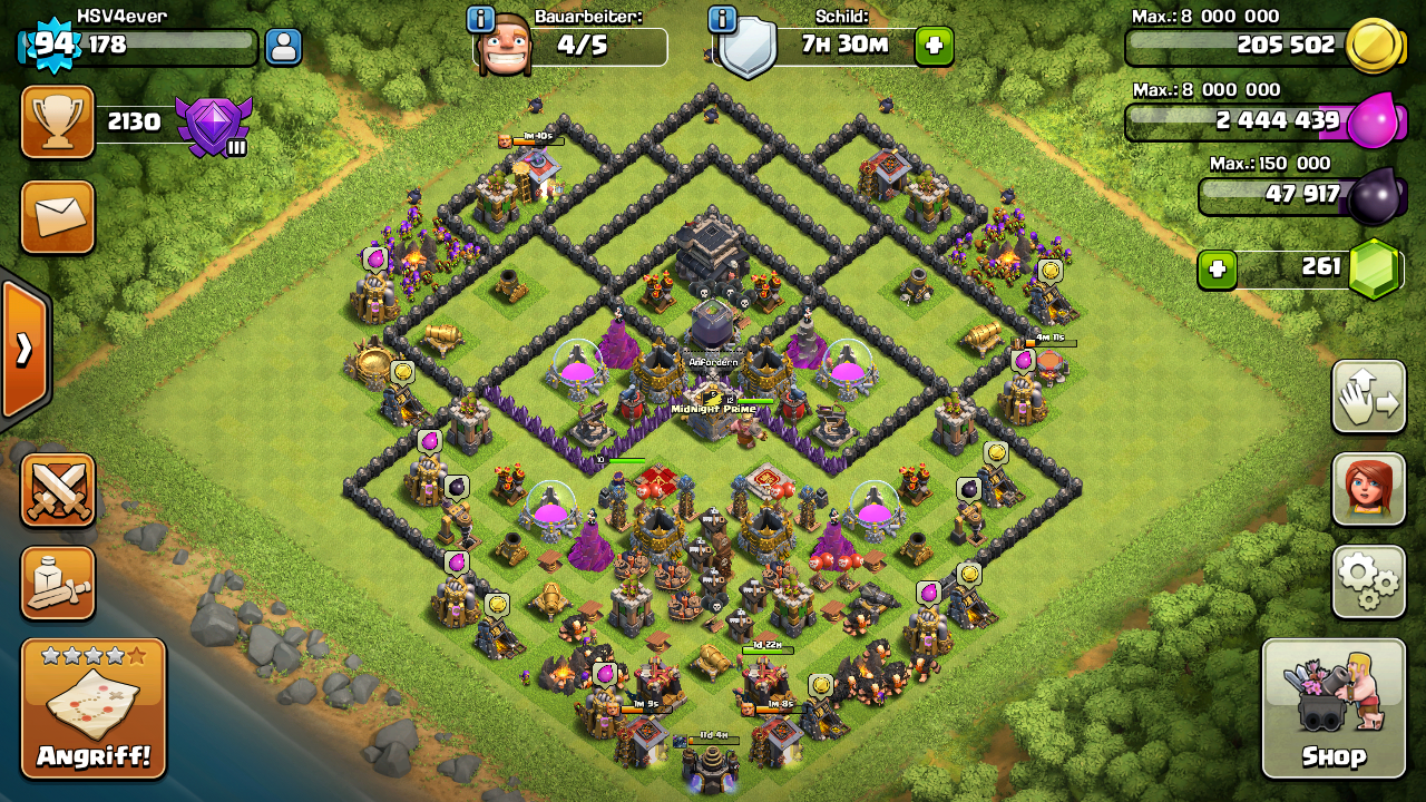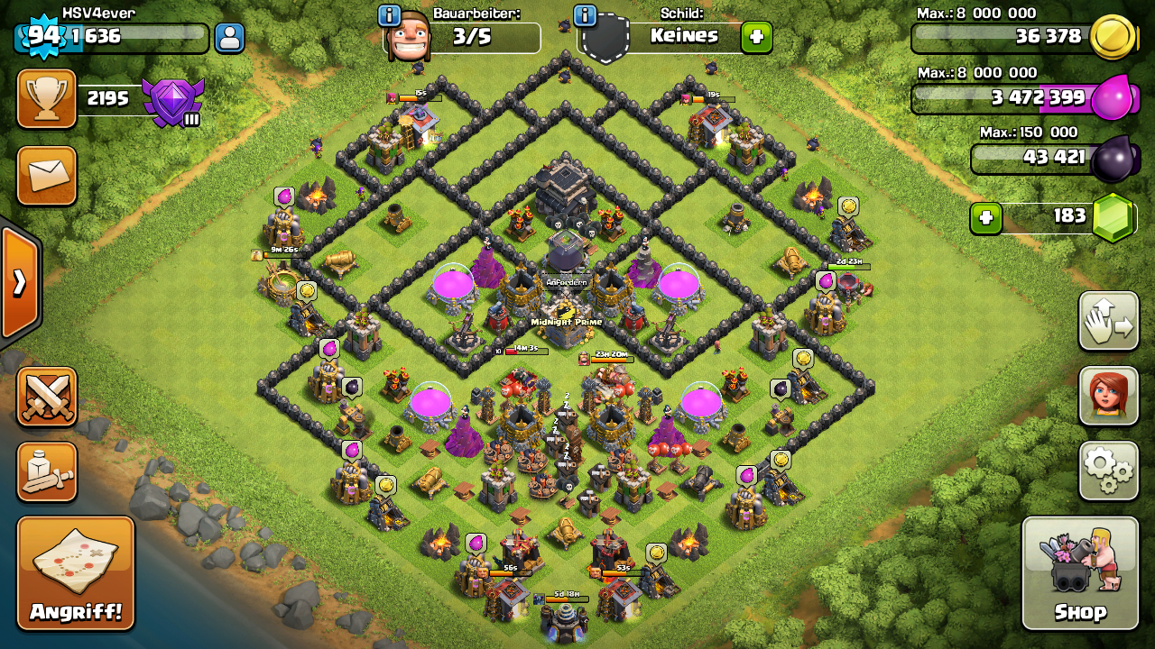 hier möchte ich Euch mal meine TH9 Base vorstellen. Ich bin Dezember letzten Jahres auf TH9 hochgegangen, nachdem ich fast ein halbes Jahr lang nicht gezockt hatte... Natürlich war das viel zu früh, meine Mauern waren noch auf Level 6, die Def nicht einmal ansatzweise max RH8, das Labor lange nicht fertig, der King natürlich auch nicht weit... Das Einzige, was ich immer zuverlässig max hatte waren die Sammler und Bohrer.