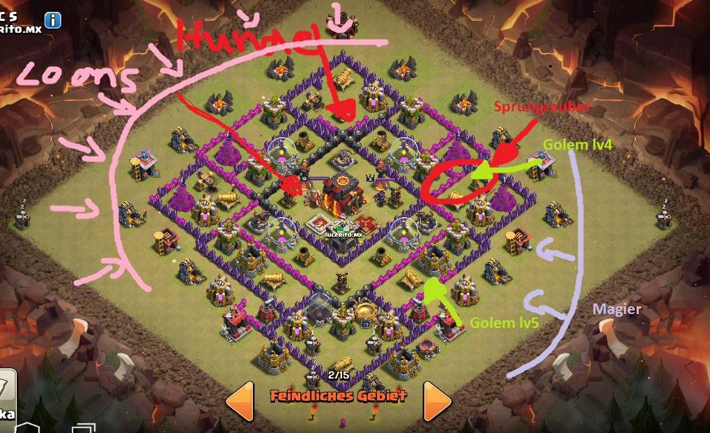 Da der Gegner realtiv schlechte Luftabwehren hat, könnteste gut GoLaLoon probieren! Allerdings würde ich dann links mit den Hunden und Loons rein gehen, da der ST-Inferno zu schnell deine Hunde verbrennt