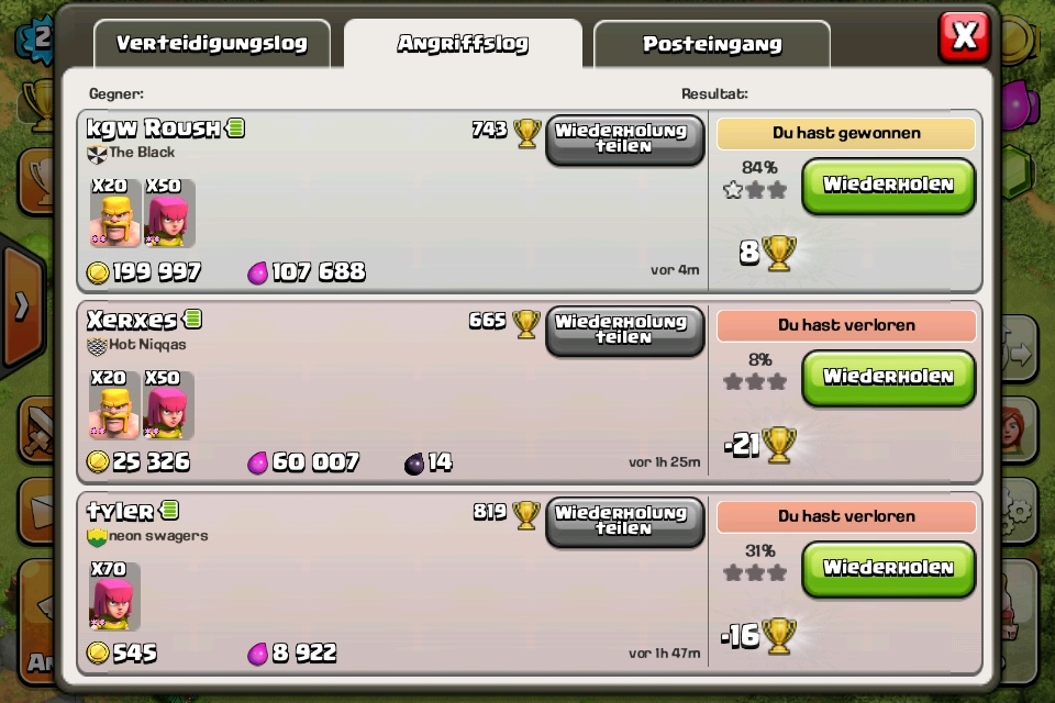 Darüber hinaus, da du dich darüber aufregst dass RH13 dich zerstören kann ich nur sagen: Pokale sind vollkommen egal, sie sagen absolut nichts aus, und haben auch nichts zu bedeuten. Selbst wenn man aktiv Pokale jagen sollte, man bekommt sie durch den Angriff, nicht durch die Verteidigung, auf eine Verteidigung folgen dann mehrere Angriffe von dir um den Pokalverlust dreimal wieder wett zu machen.