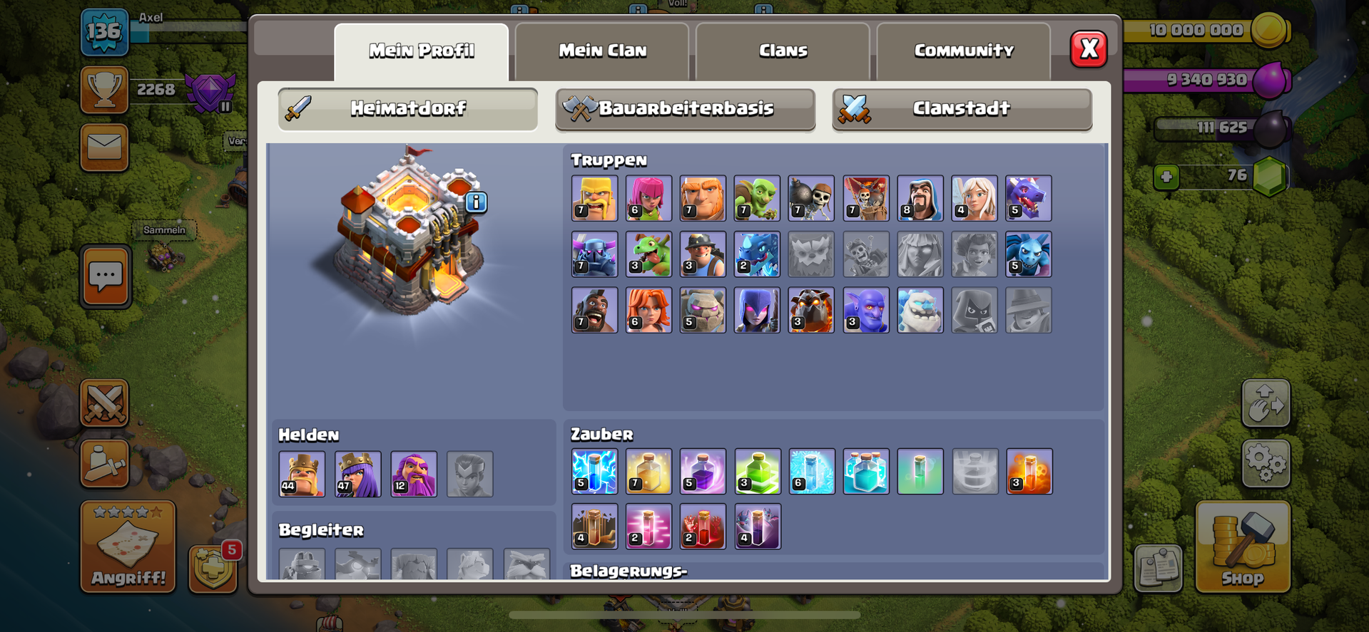 Inferno,X Bogen , Tesla , luftabwehr , ardler , Armelager, Kaserne , Zaubertränke , Mauern, Feger alles auf Max.