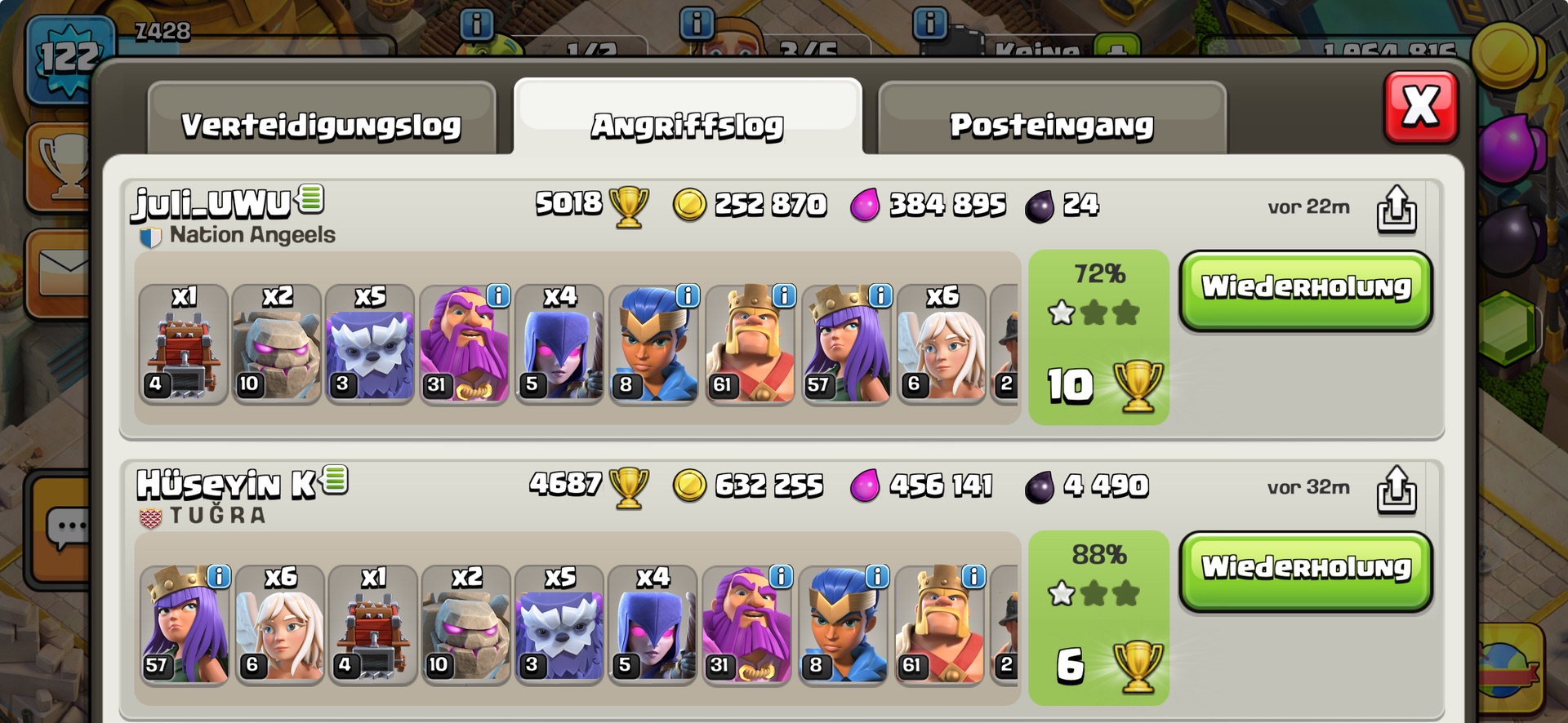 Seit Monaten funktioniert das mit den Vergeltungsangriffen nicht mehr. Früher hatte man immer wieder die Möglichkeit hier seinen Punktestand auszugleichen (Fake-Legende). Mittlerweile kann man keine Gegenangriffe mehr machen und muss warten bis man endlich wieder unter 5000 Punkte ist damit man wieder angreifen kann, wenn man nicht in die Liga möchte. Was bezweckt Supercell damit ?? Ich kann mir nicht vorstellen das aus meiner Liste von Angriffen, alle Spieler dauerhaft ein Shield oben haben. Teilweise tagelang. Von 20 Angriffen kann man keinen einzigen gegen angreifen. Was ist da los ?
