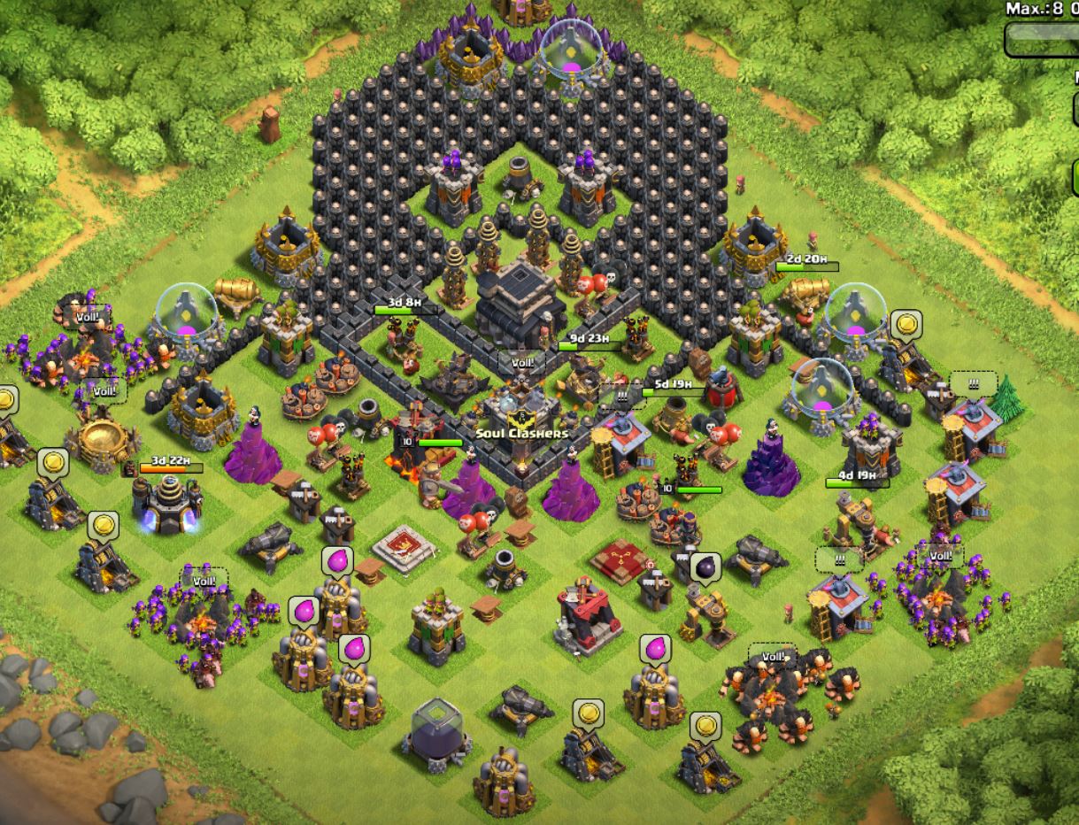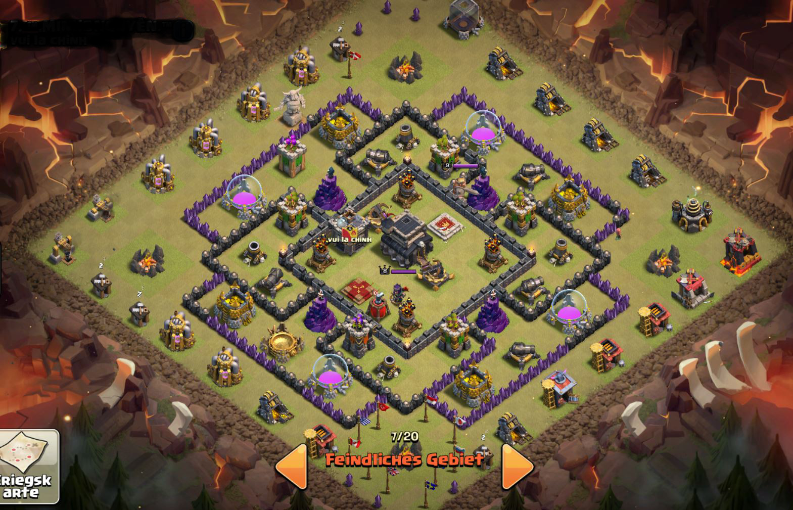 Auf der linken Seite je einen lv3 Golem bei den Armeelager so, dass die auf sie Mienenwerfer zulaufen, dahinter je 4-5 Magier, in der Mitte einen lv5 Golem aus der cb (Vor dem Bogieturm) mit 6-8 magiern, helden (beide lv10) und 4 Hexen (lv1).