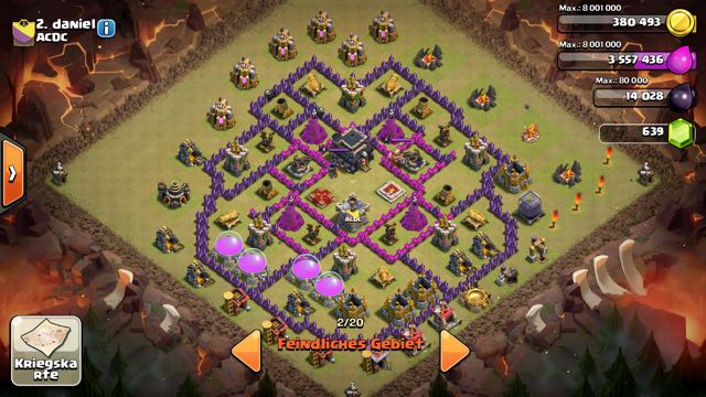 Alles anzeigenDer CK startet und unsere Nr. 1 (RH10 !!!) greift ihn an (klare 3 Sterne), obwohl es längst feststand, dass ich ihn angreife. Meine Truppen haben aber nur für ihn funktioniert und ich habe ihn trotzdem angegriffen, 83% (ohne Rathaus; die Drachen haben alles drumherum zerstört), hab folgende Taktik gewählt: