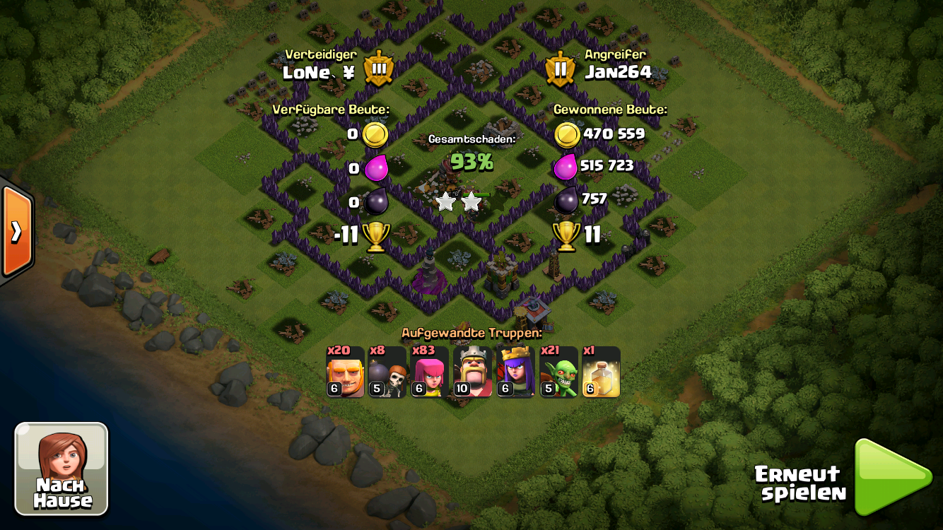 Hi, also ich hatte dein Dorf auch nochmals umgebaut und die LU gebündelt um das RH gestellt - dazu noch alle Luftbomben und die Bogen auf Boden-/Luft. Ja, hatte geklappt gegen 12 max. Drachen und König & Queen bestanden. Der Gegner holte nur einen Stern - wobei unser Gegner richtig stark war - alle anderen RH8/RH7 hatte er mit Drachen überrannt. ...In einem 20er Feld haben wir 42:56 verloren!!!!