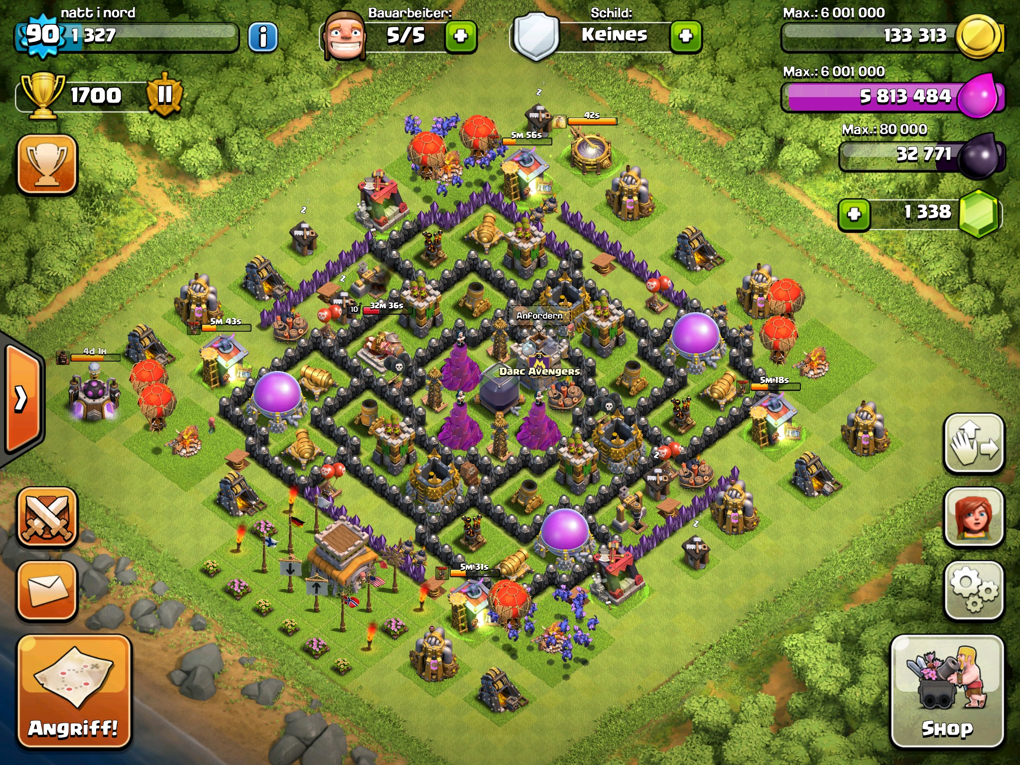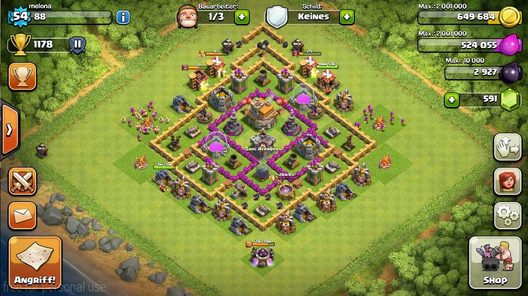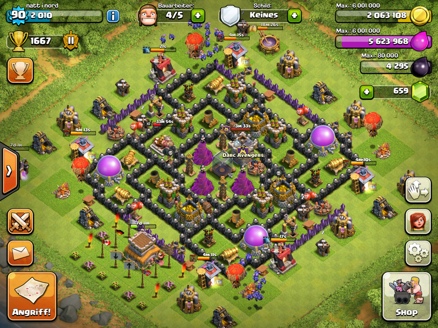 Das Dorf ist geklaut und abgewandelt. Als nächstes Ziel hab ich die Errichtung der Teslas und ich versuche, irgendwann mal an genug Dunkles für den König zu kommen. Wenn die Riesen im Labor durch sind, fang ich an Rh7er zu ärgern. Und ich will heute mal auf 1250 Trophäen für die Juwelen, damit ich den vierten Bauarbeiter kriege.