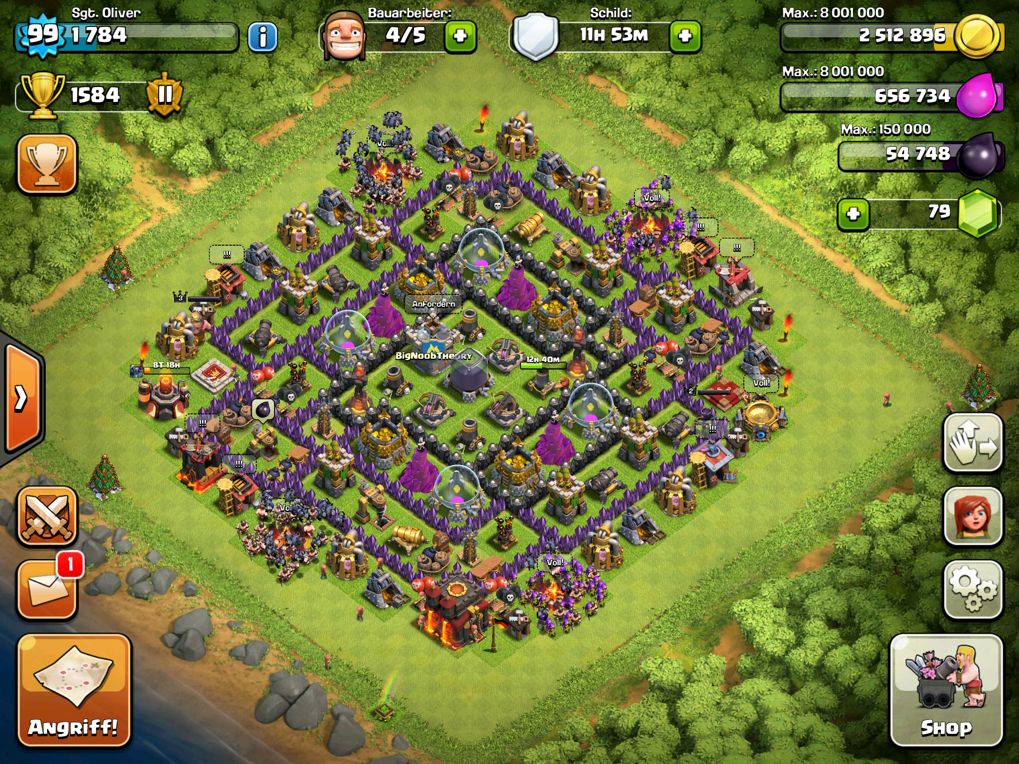 Ich bin leider am Anfang ohne drüber nach zu denken direkt auf Rathaus Level 10 durchgestartet und nun hab ich den Salat!Aber egal das hier ist meine erste selbst gestaltete Base mit der ich aber noch nicht so richtig zufrieden bin. Mal sehen wie die sich gegen die ersten Angriffe schlägt.