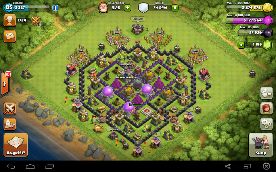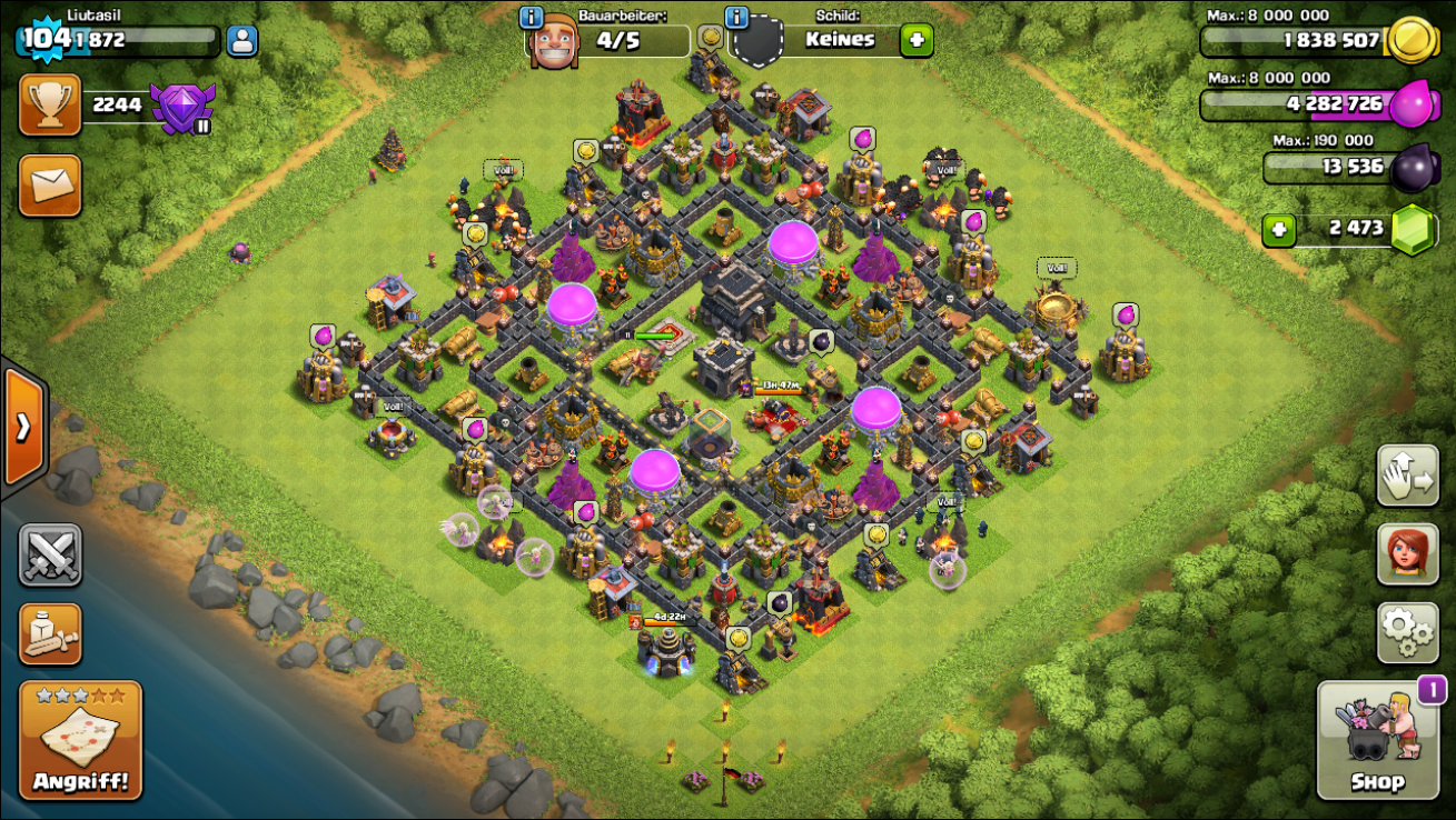 Ich habe schon einiges gemacht an der Base. Fast alle Truppen sind auf max., die Walküre läuft noch 5 Tage und die die dunklen Zauber müssen noch. Der Magier auf 7 wird auf jeden Fall noch gemacht. Bombenturm wird aufgebaut.