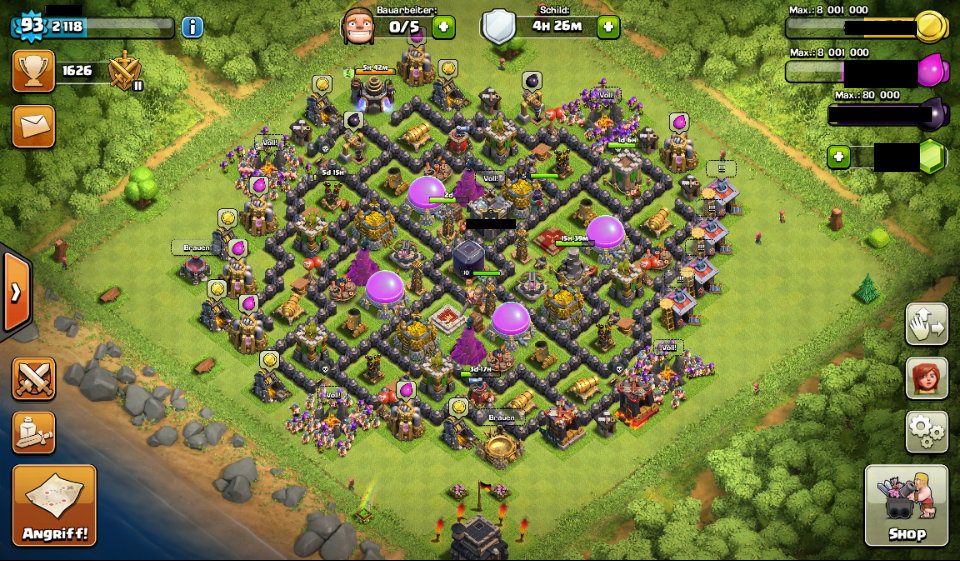 Alle Mauern sind auf 9, die ersten 18 sind auf Level 10. Die Kasernen werden nach und nach gemacht und die Queen wird auf Level 15 erstmal hochgezogen.