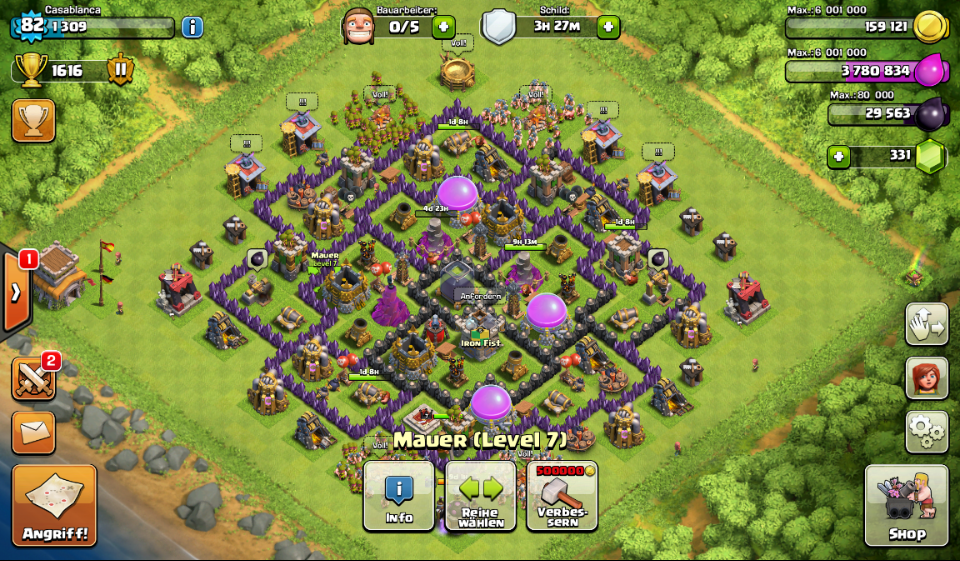 In der vergangenen Zeit habe 61 Mauern auf Level 8 gebracht und habe meine letzte Luftabwehr auf Level 6 und damit auf maximum fertig bekommen.