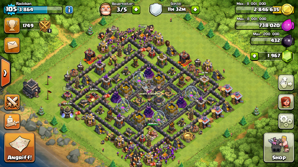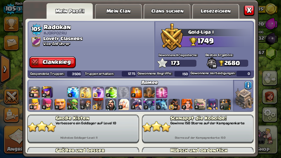 Im Moment mache ich nur die Clankriege am WE mit, unter der Woche leveln die Helden, im Moment geht die Queen auf 11.
