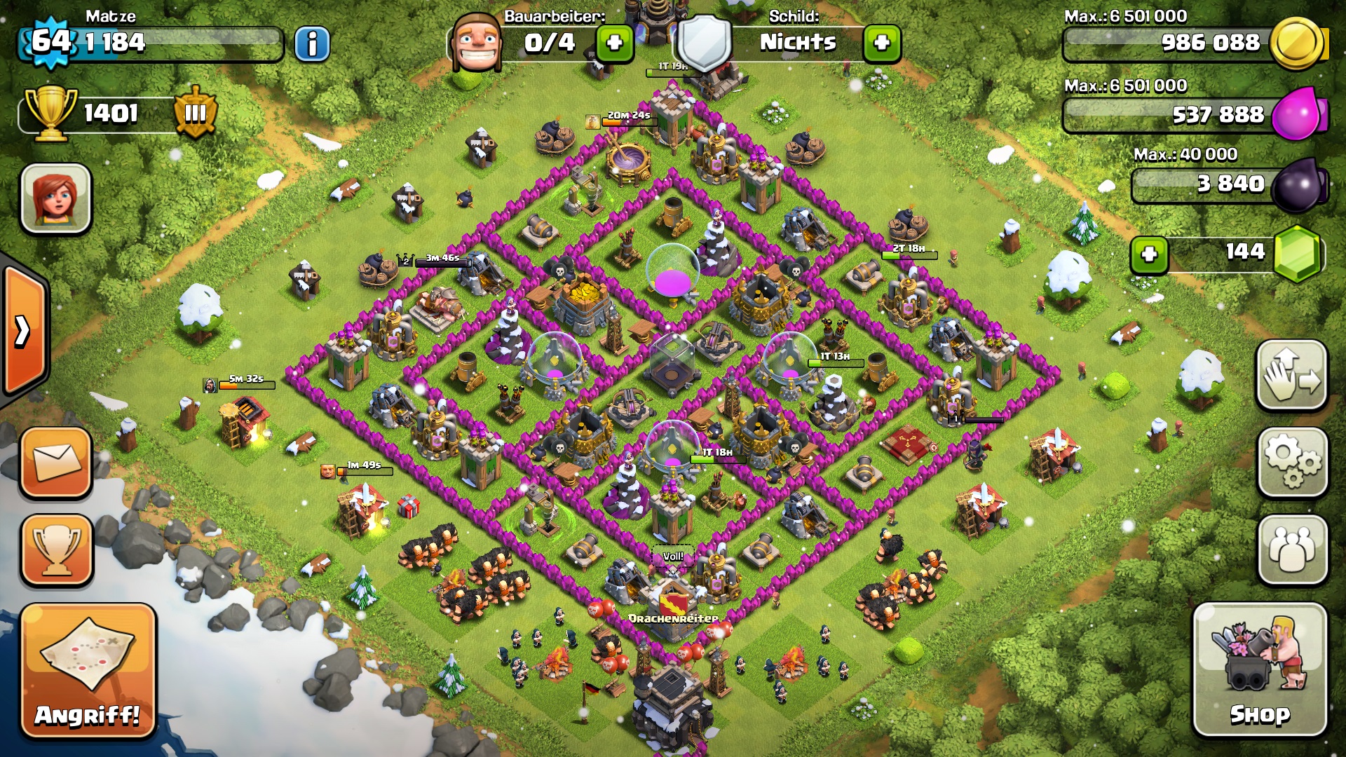 Du solltest unbedingt deine Gebäude upgraden. Die Level (vor allem der Mauern) sind viel zu niedrig.